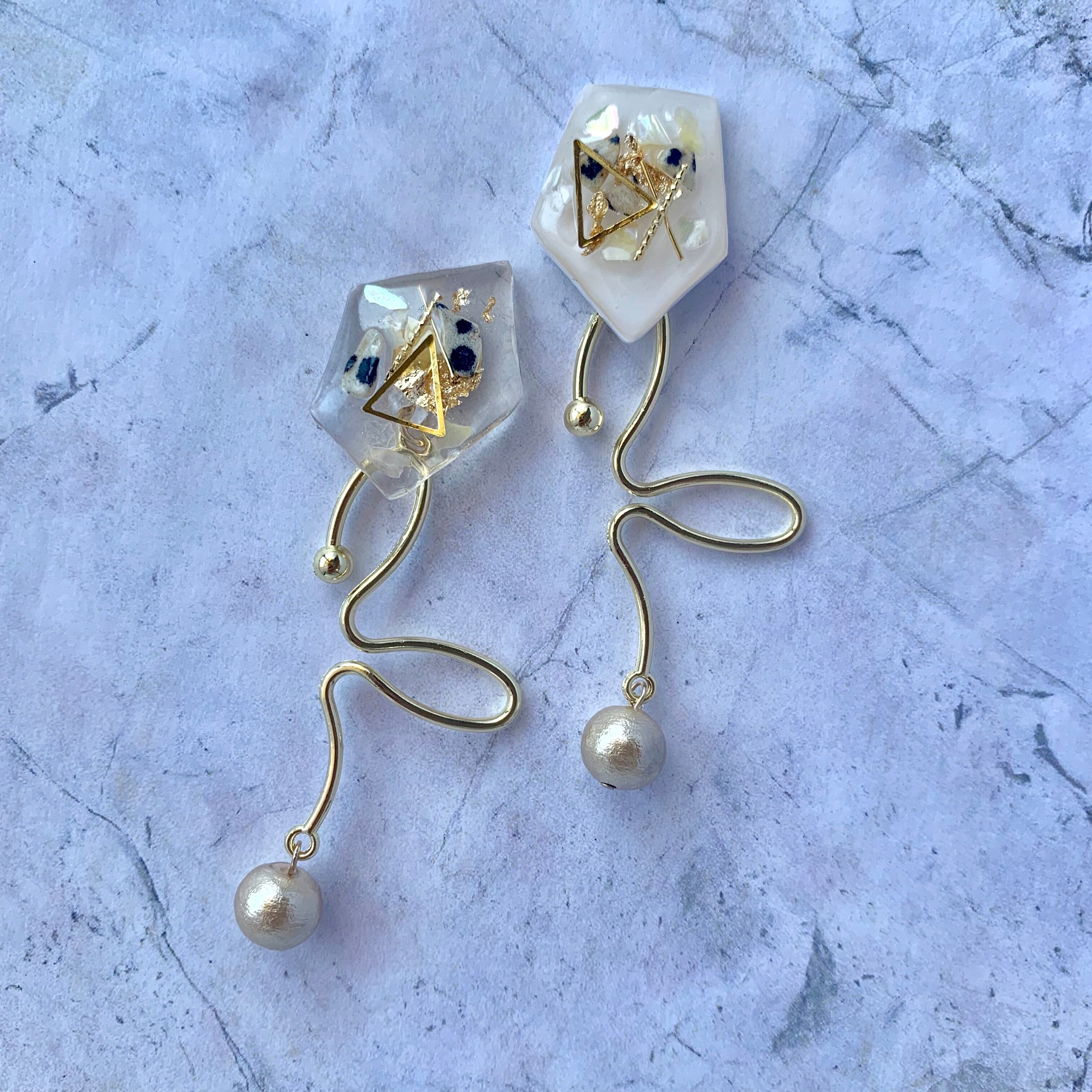 さざれ石ダルメシアン幾何学×ゴールドコットンパールピアス
