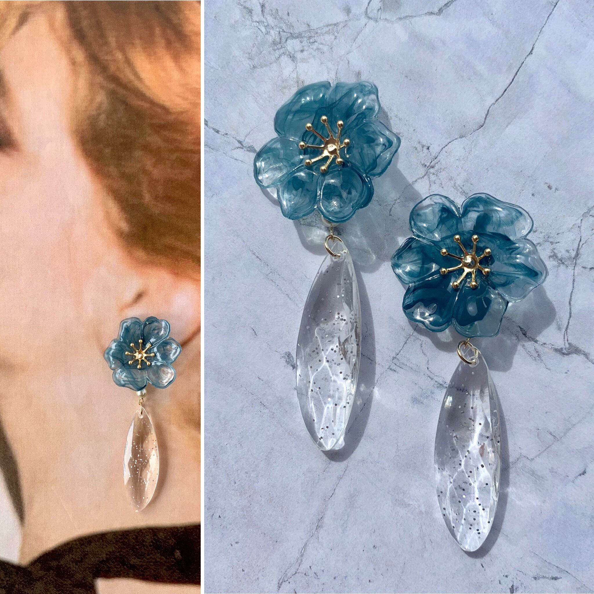 ブルーフラワー×ロングクリアピアス