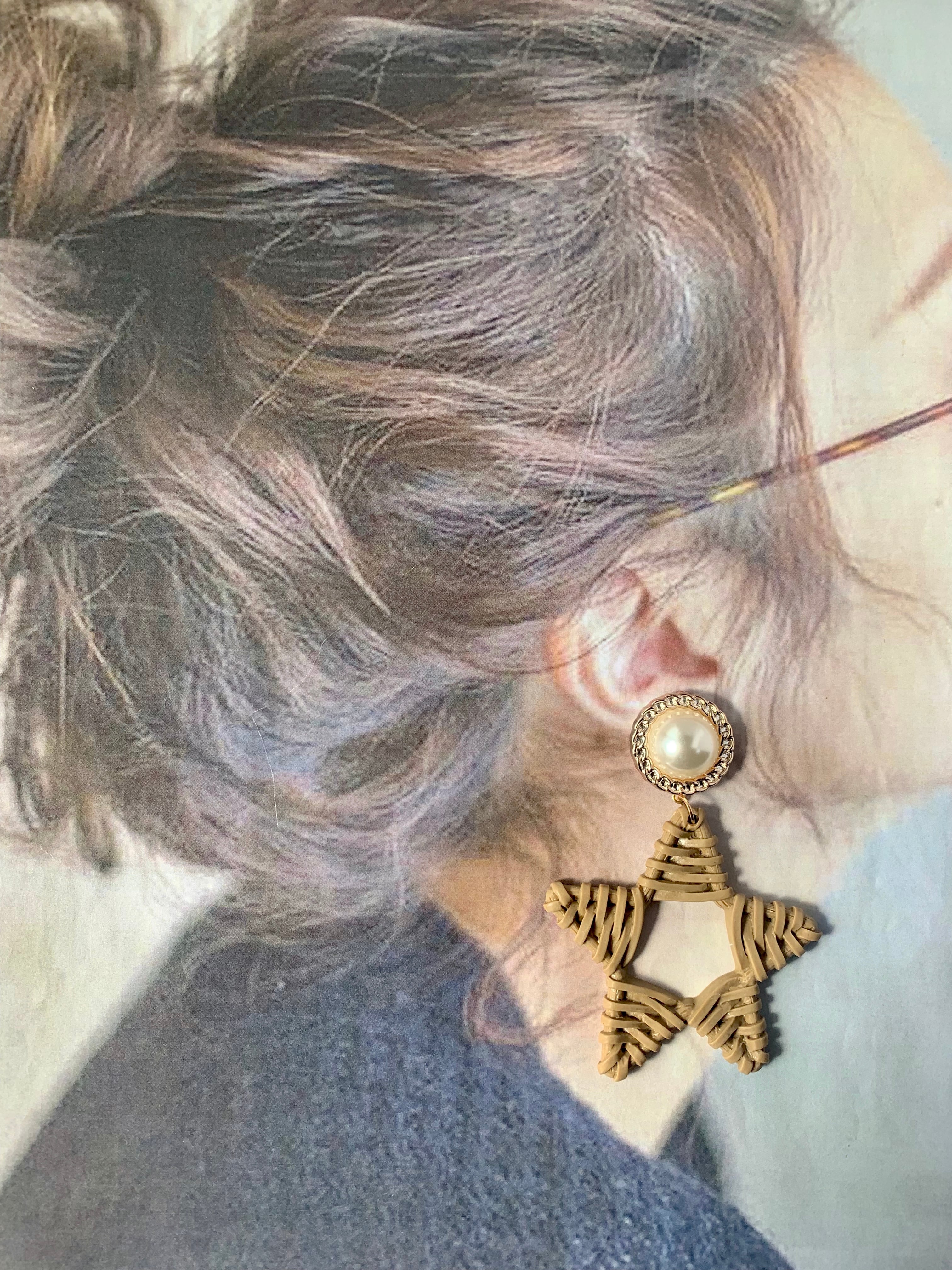 パールカボション×ラタン風ビッグスターピアス モカ