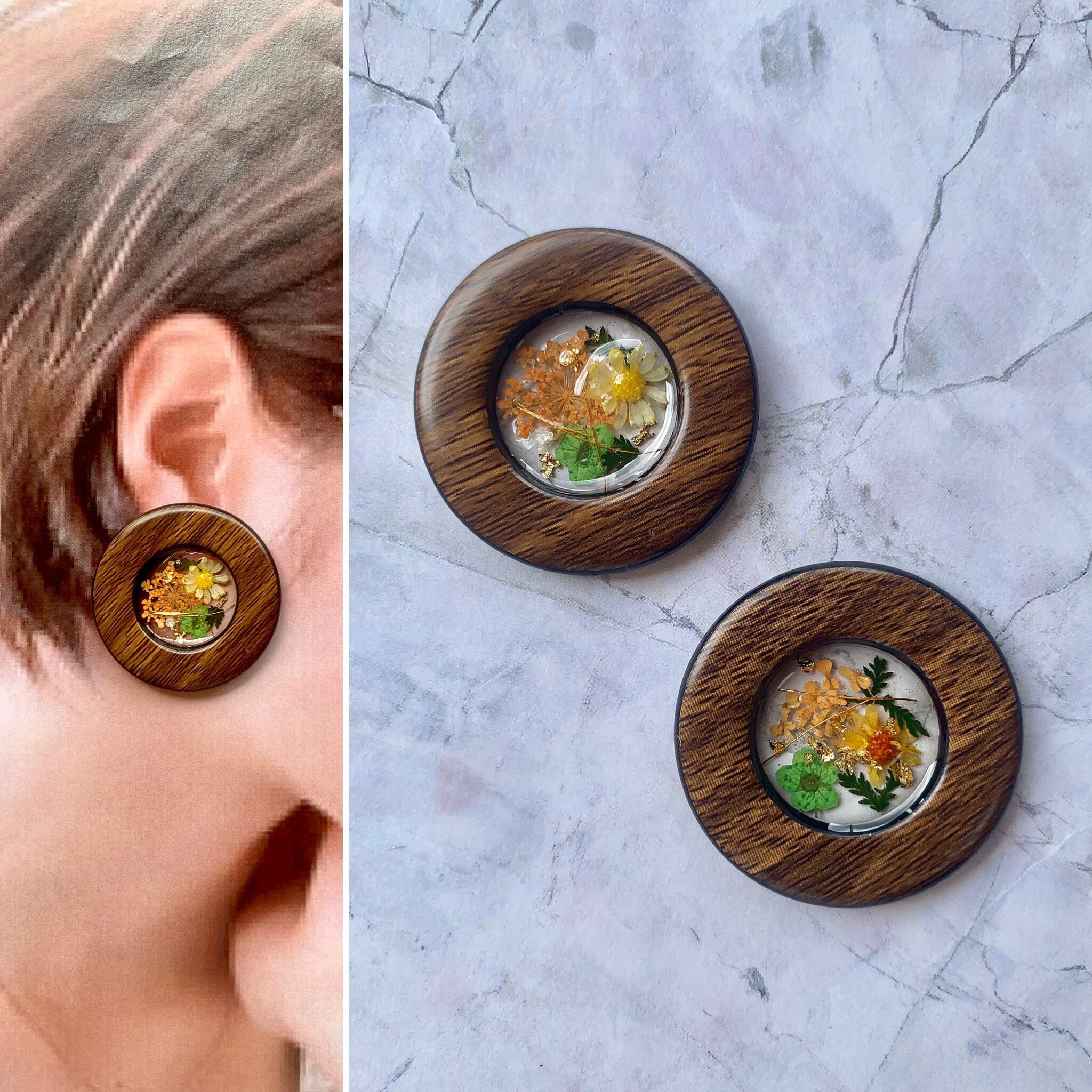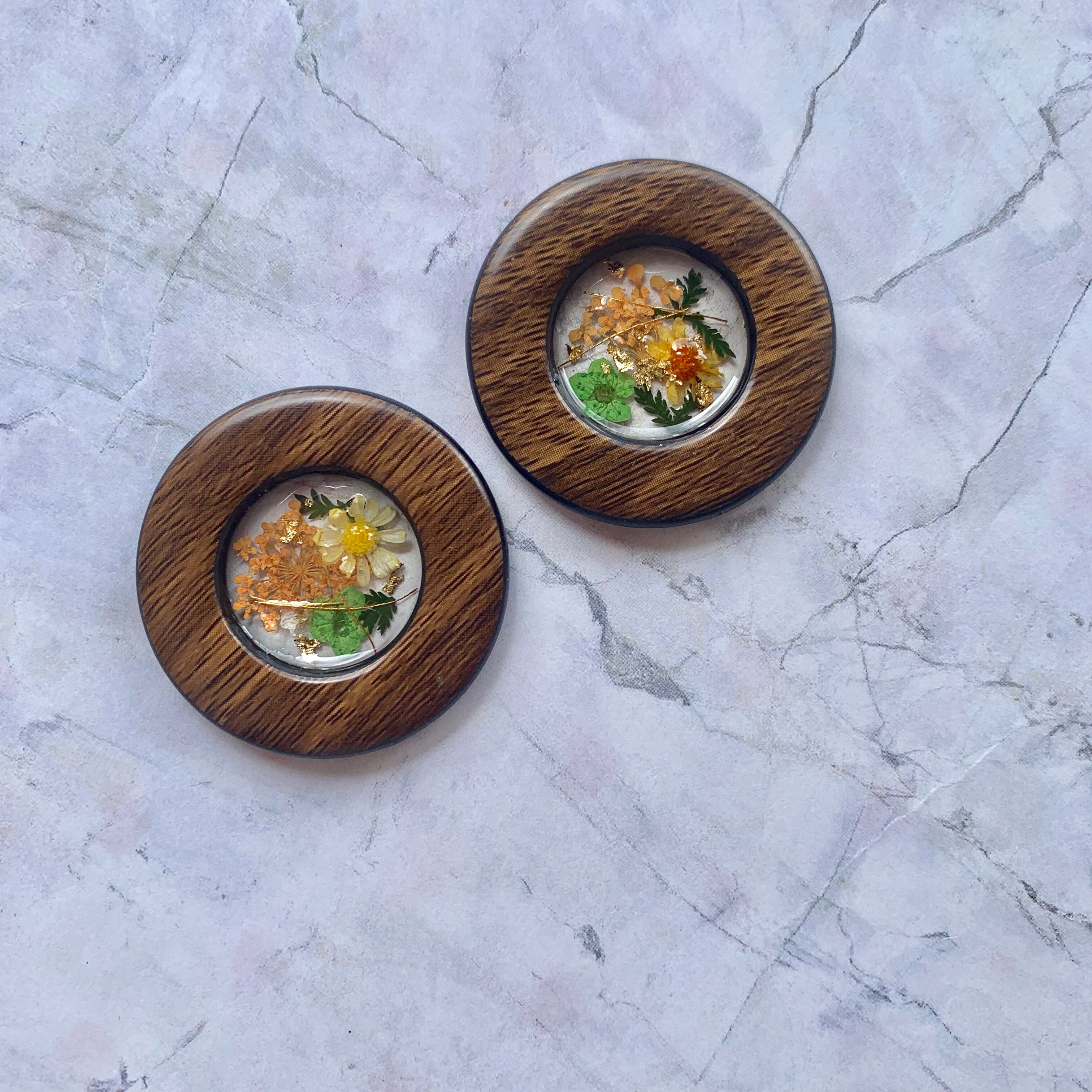 ウッド枠フラワー閉じ込めピアス オレンジかすみ草