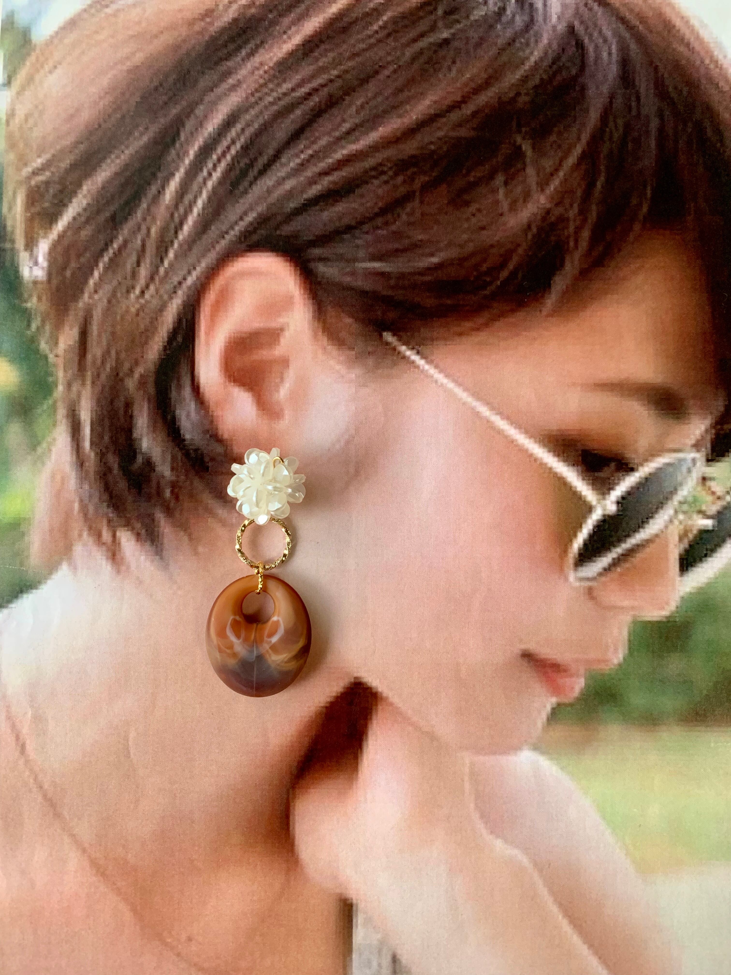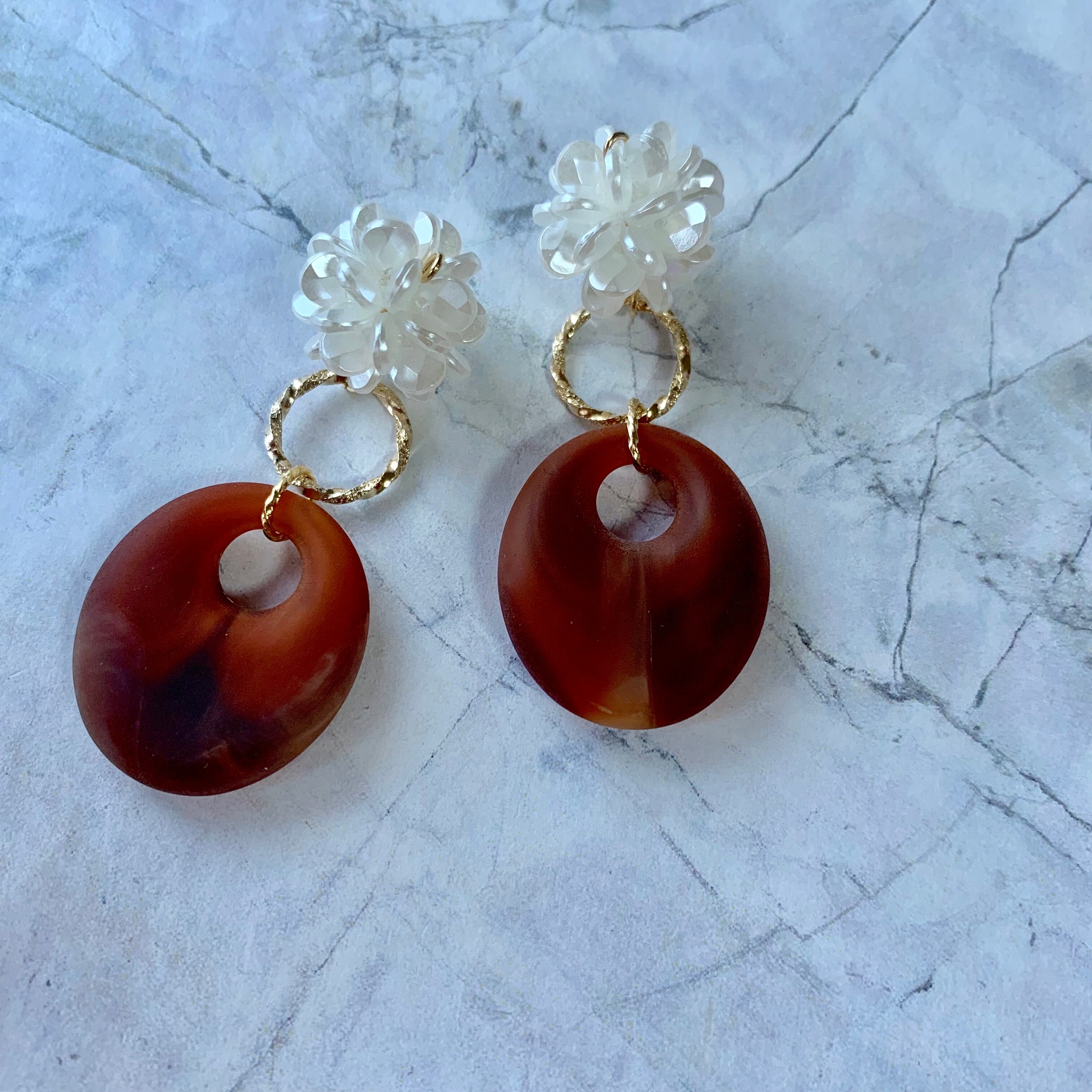 ミニフラワーボール×ぷっくり中抜きピアス ブラウン