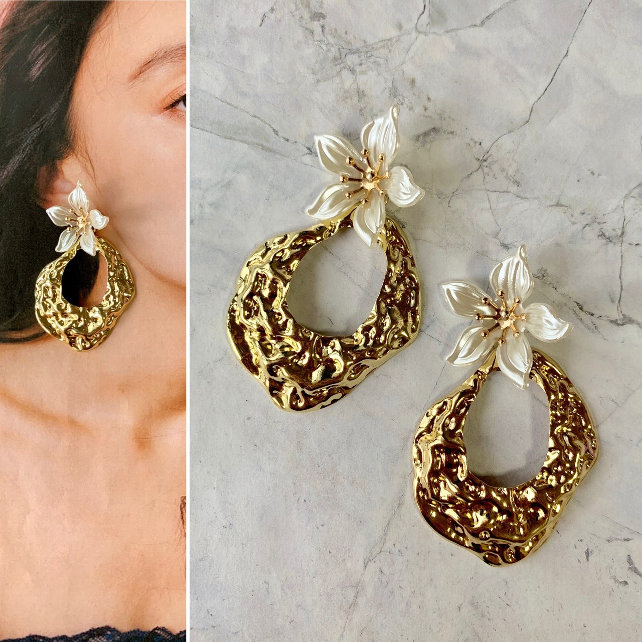ホワイトフラワー×大ぶりゴールドピアス