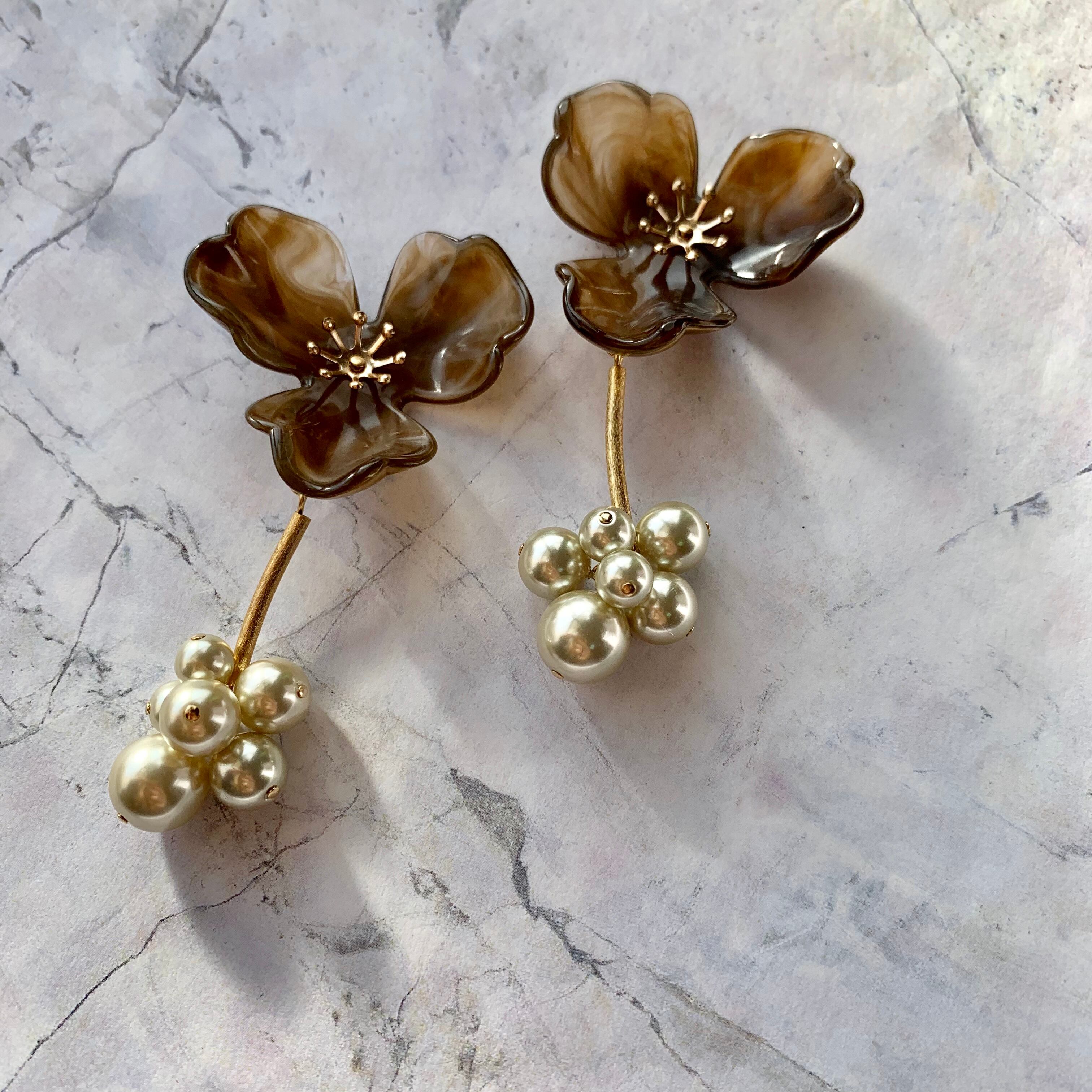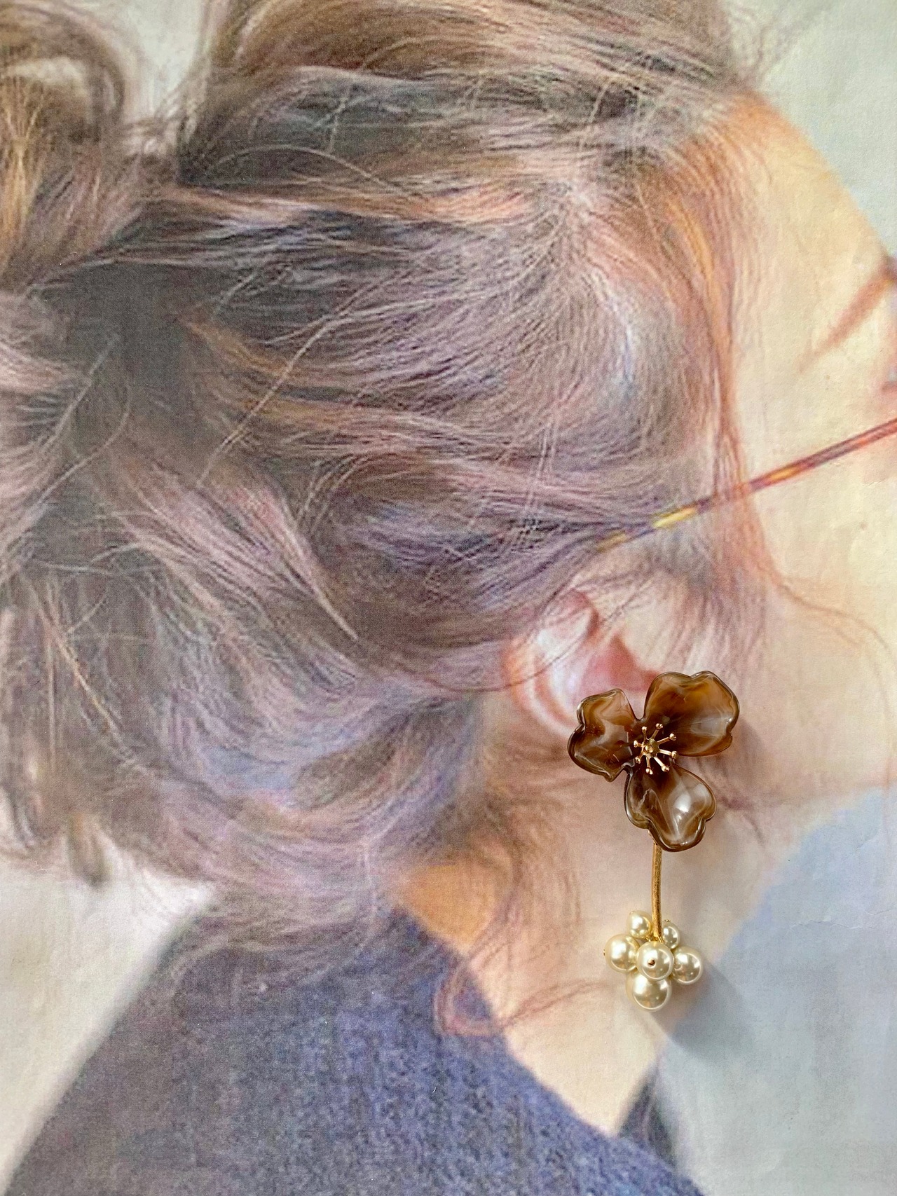 大ぶりラテフラワー×じゃらじゃらピアス ブラウン