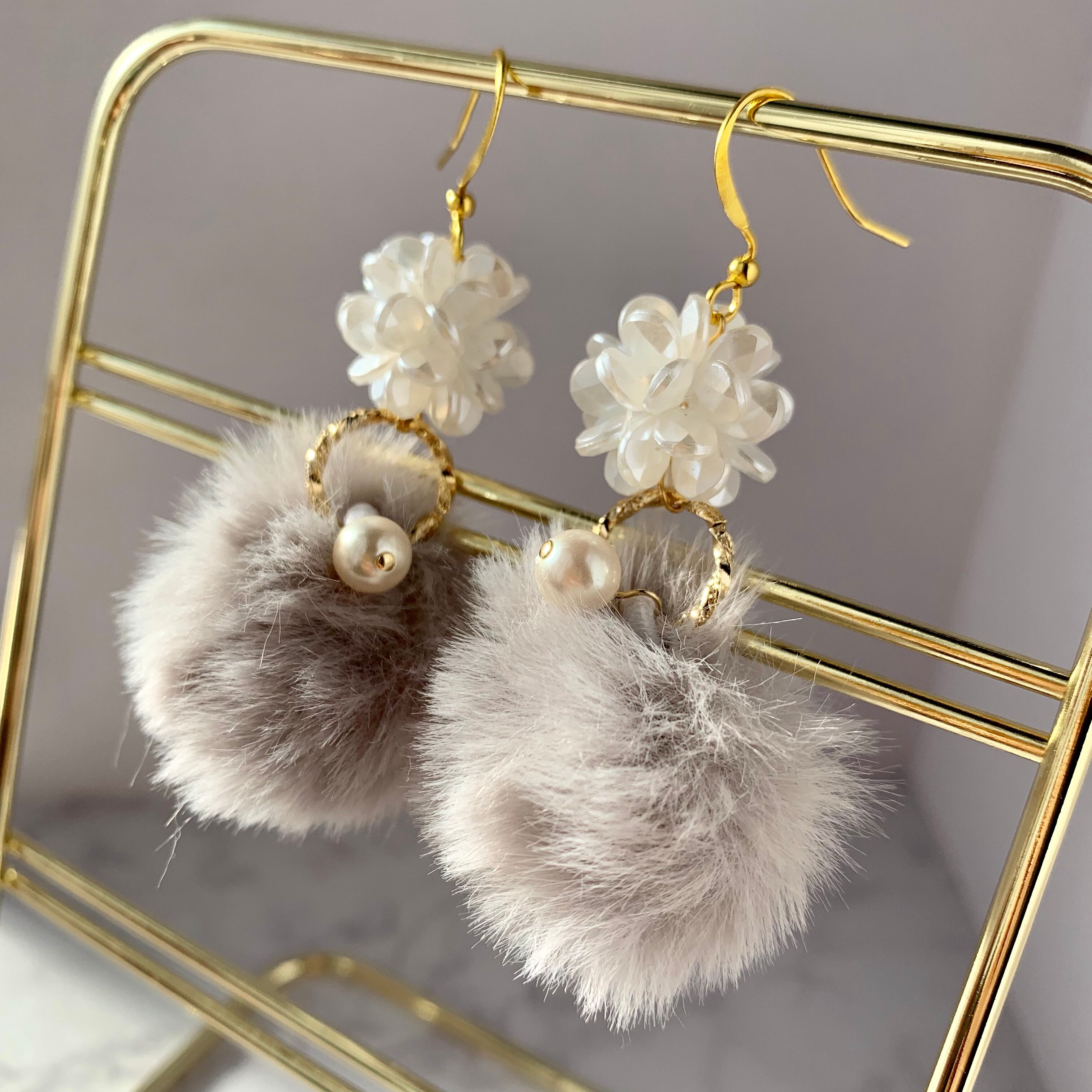パールフラワー×ファーボールピアス ライトグレー