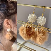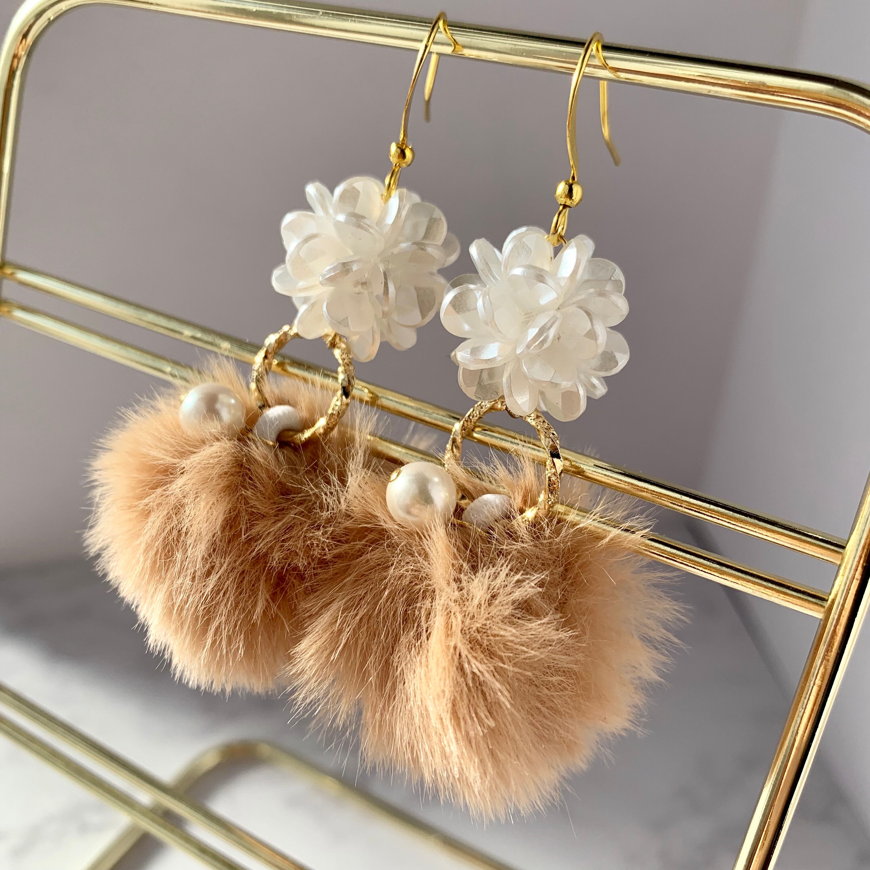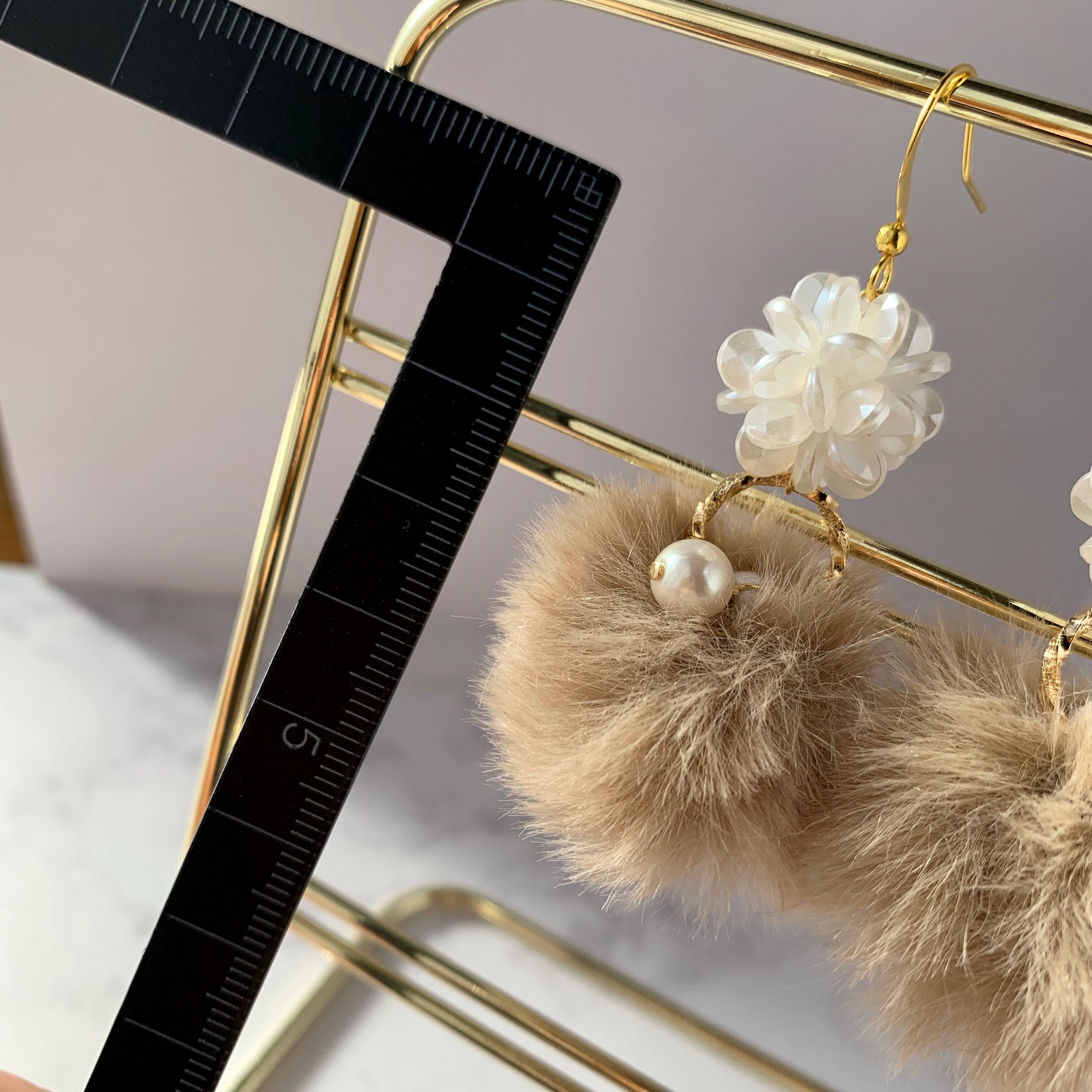 【1点物*】パールフラワー×ファーボールピアス ライトブラウン