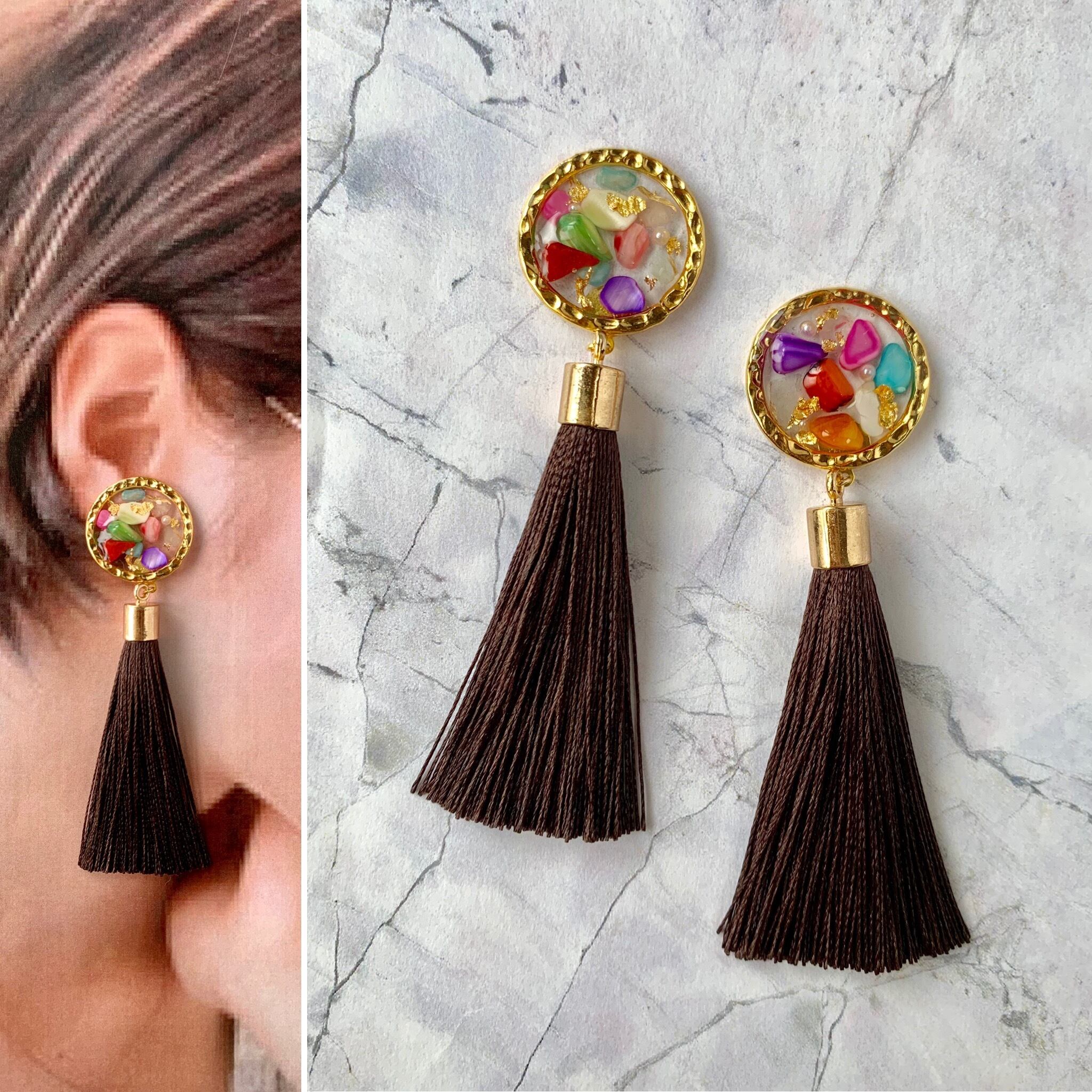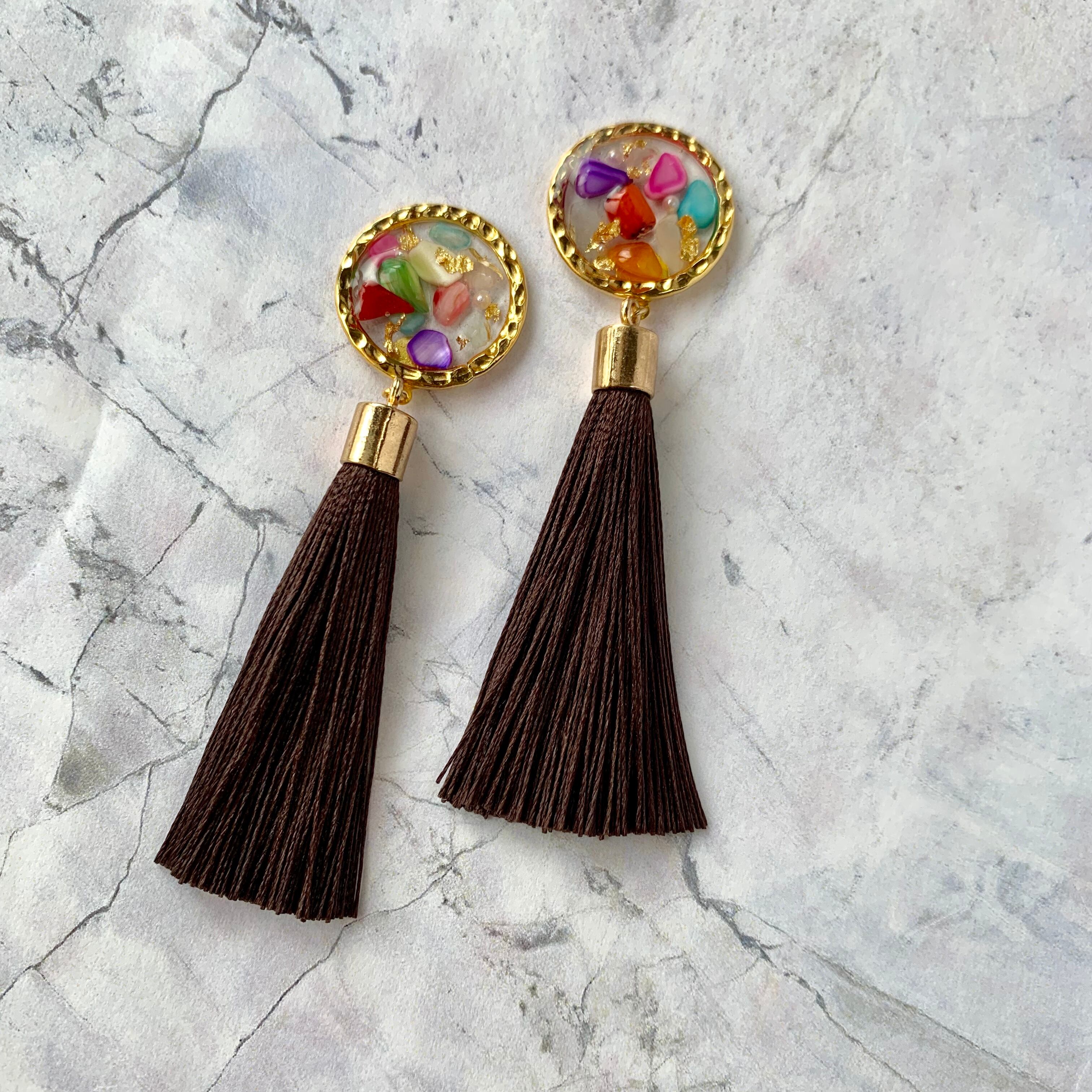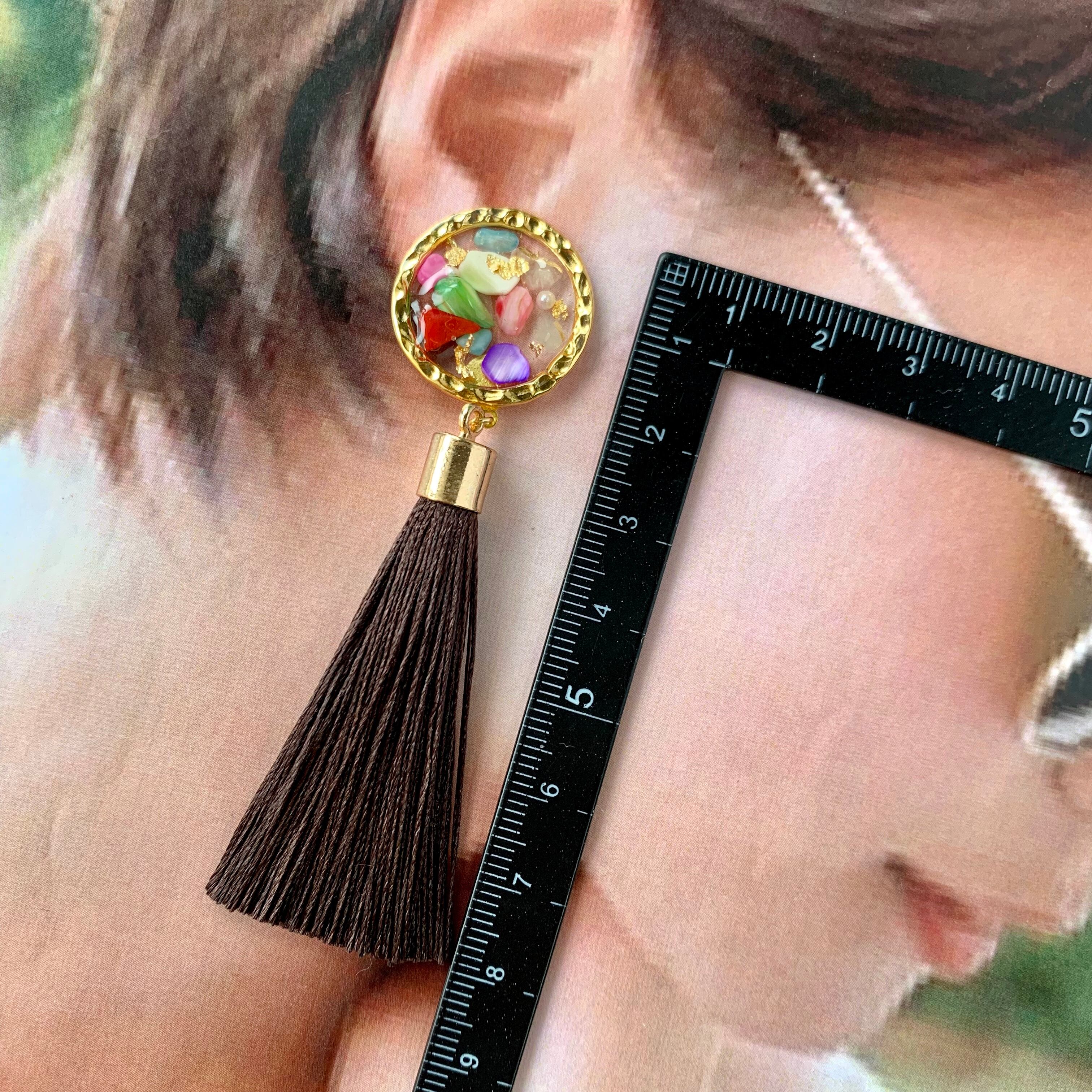 【1点物*】さざれ石×上質タッセルピアス ダークブラウン