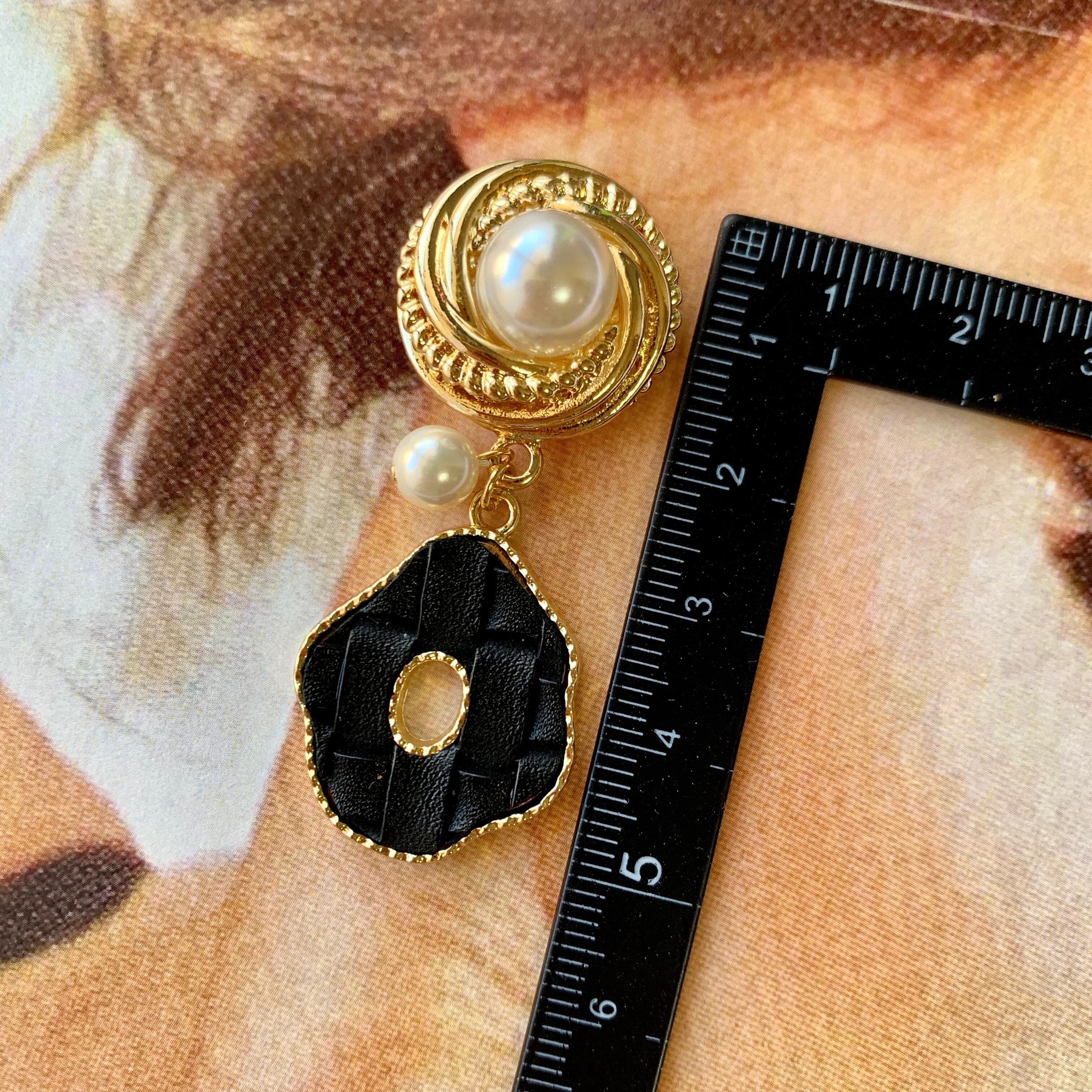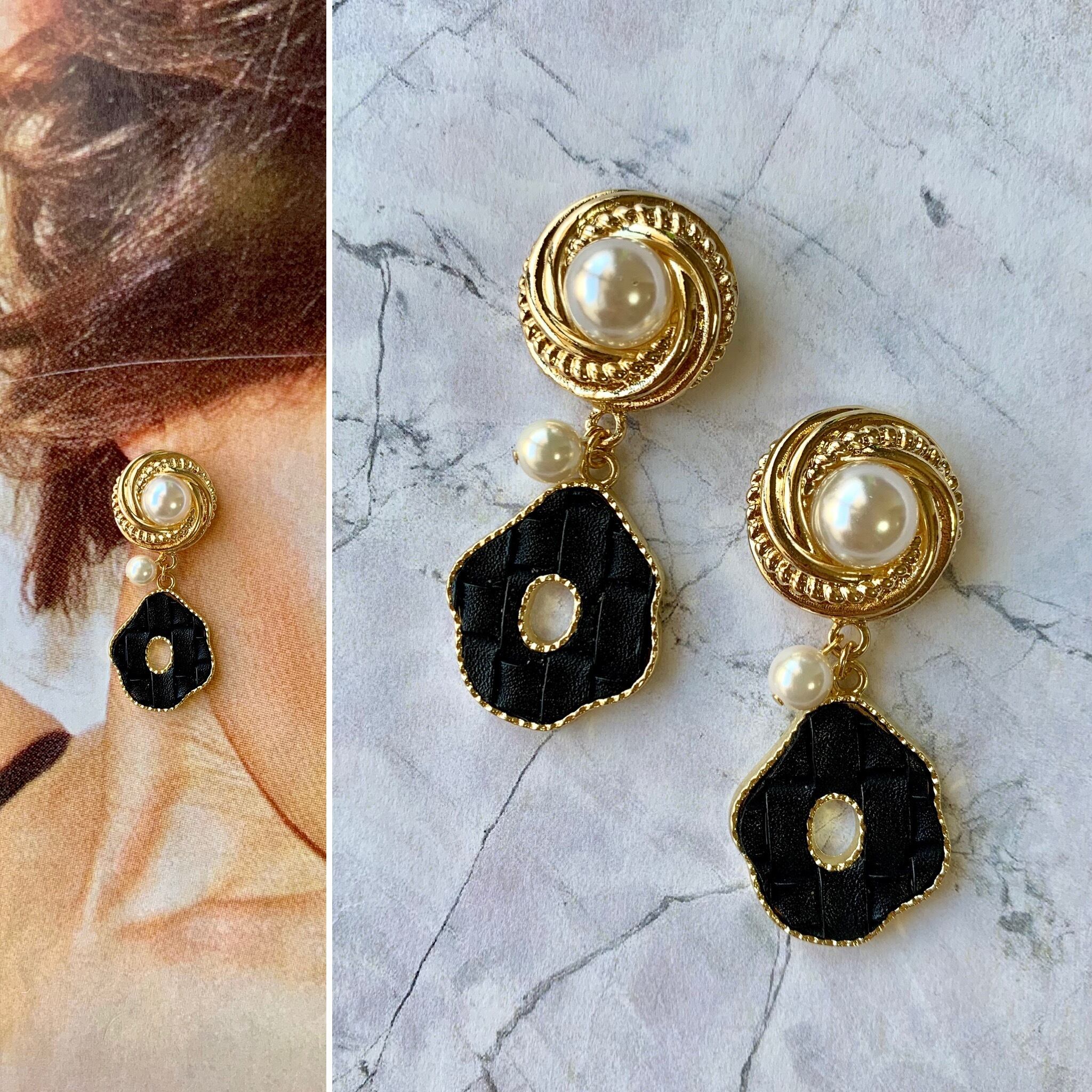 【1点物*】アンティーク風カボション×中抜きレザー調ピアス ブラック