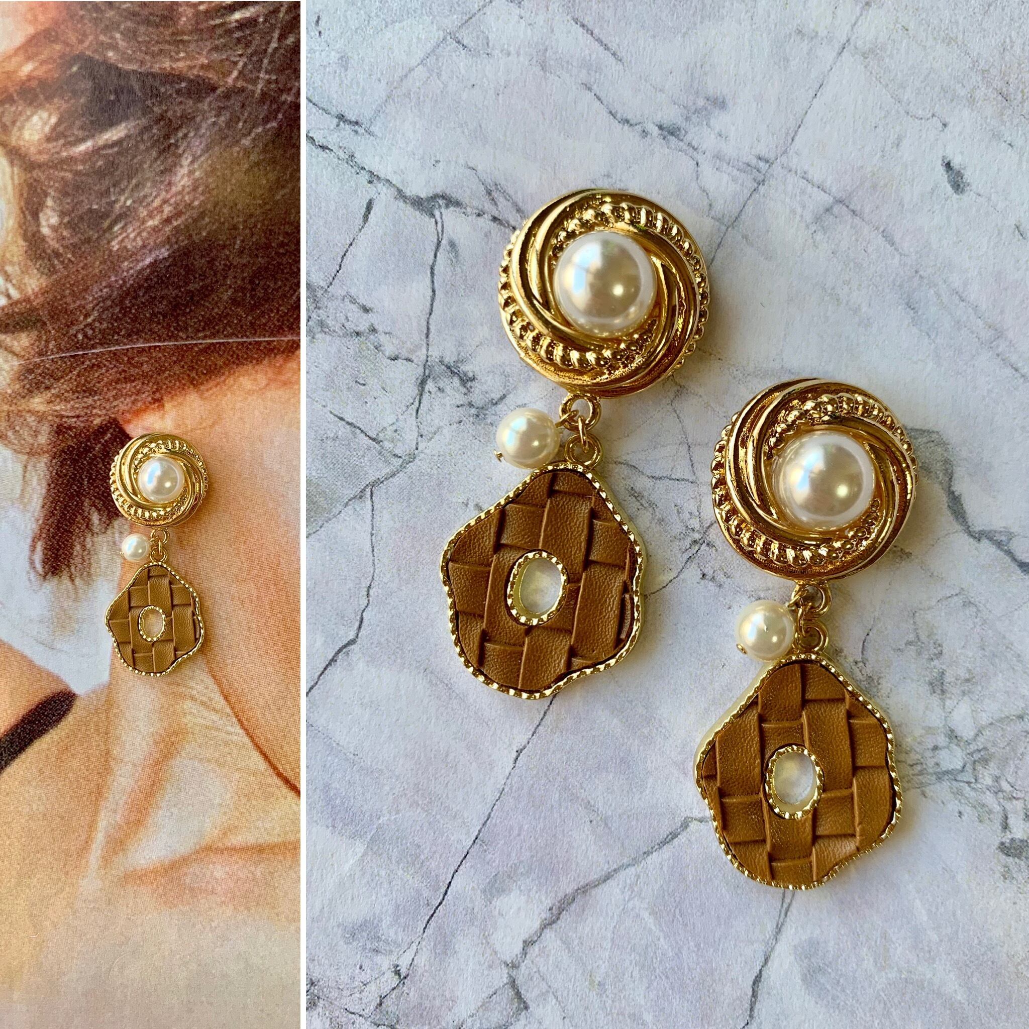 アンティーク風カボション×中抜きレザー調ピアス キャメル