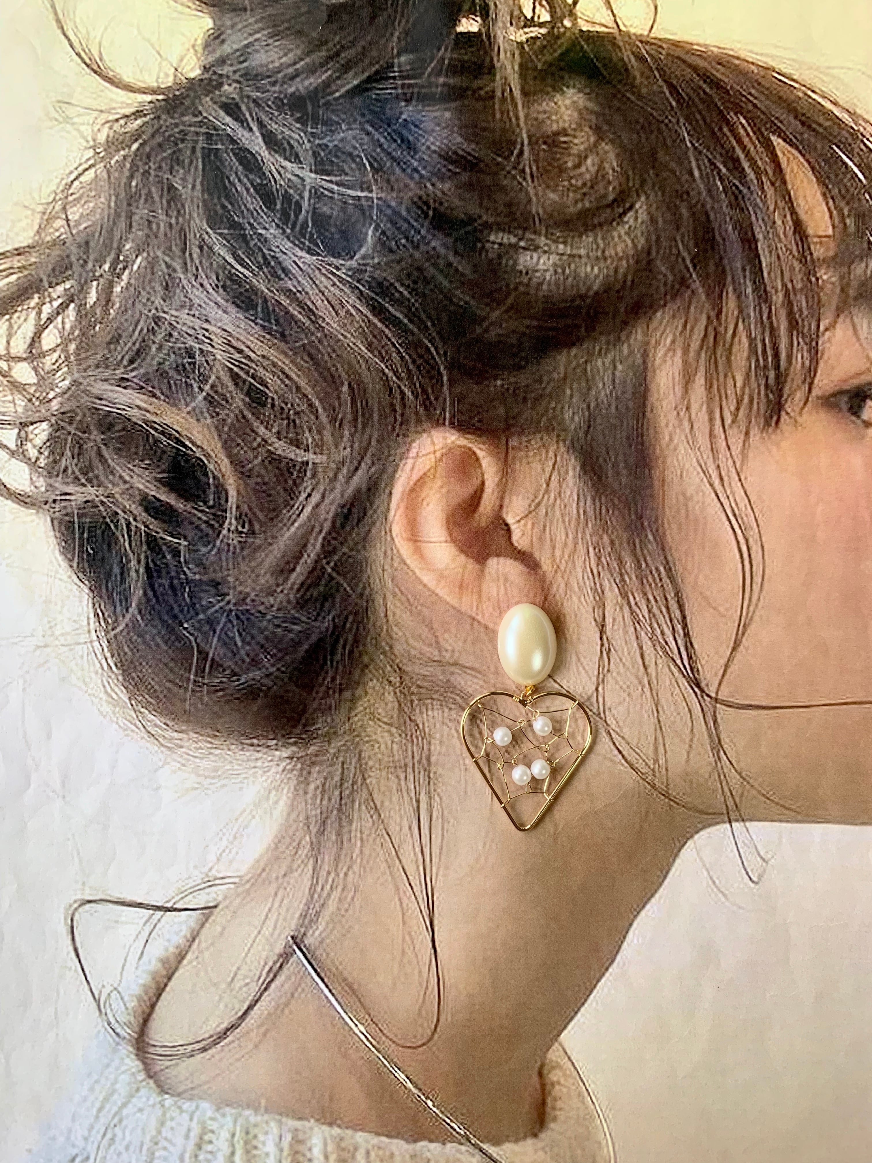 【1点物*】楕円パールカボション×ワイヤーハートピアス