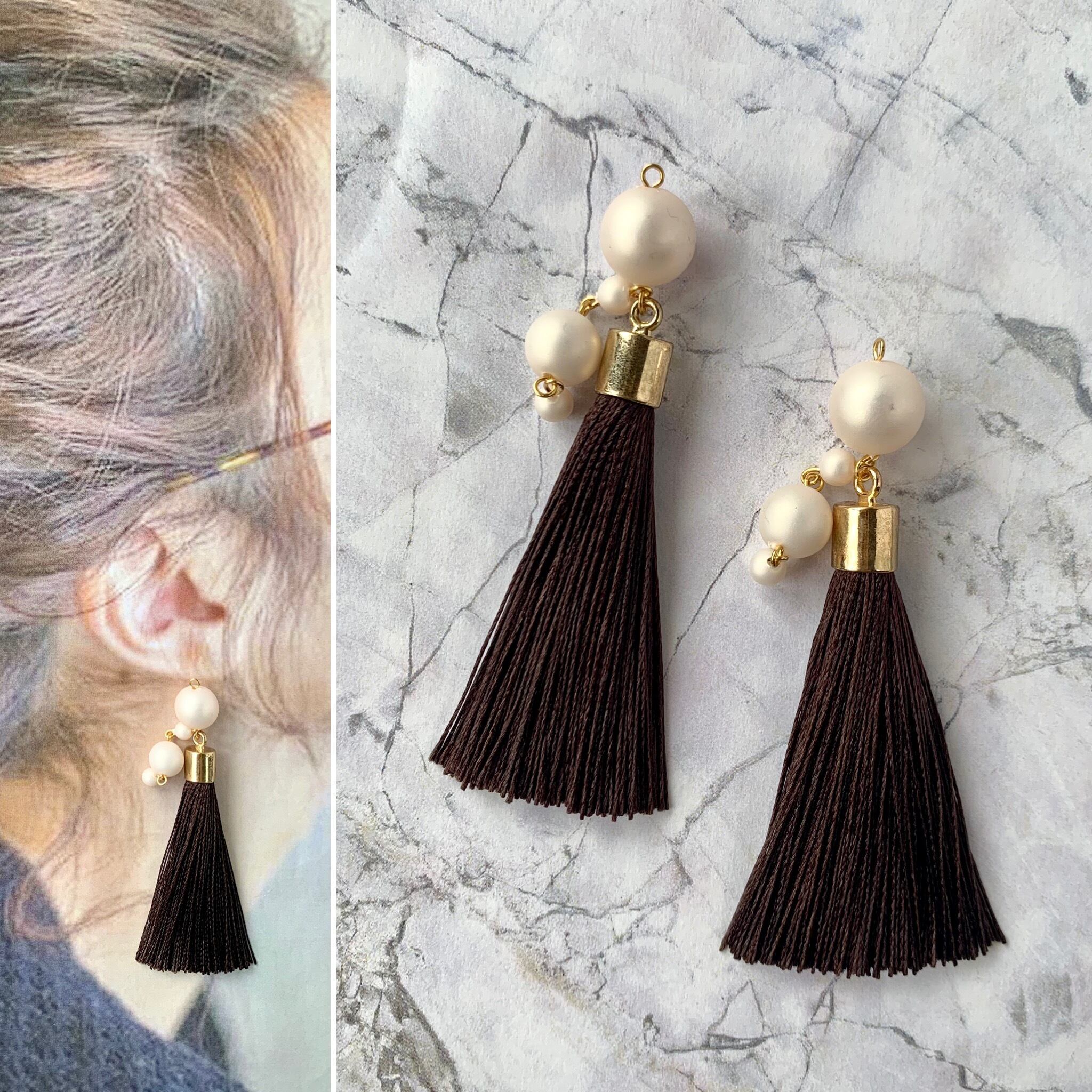 【1点物*】マットパール×上質タッセルピアス ダークブラウン