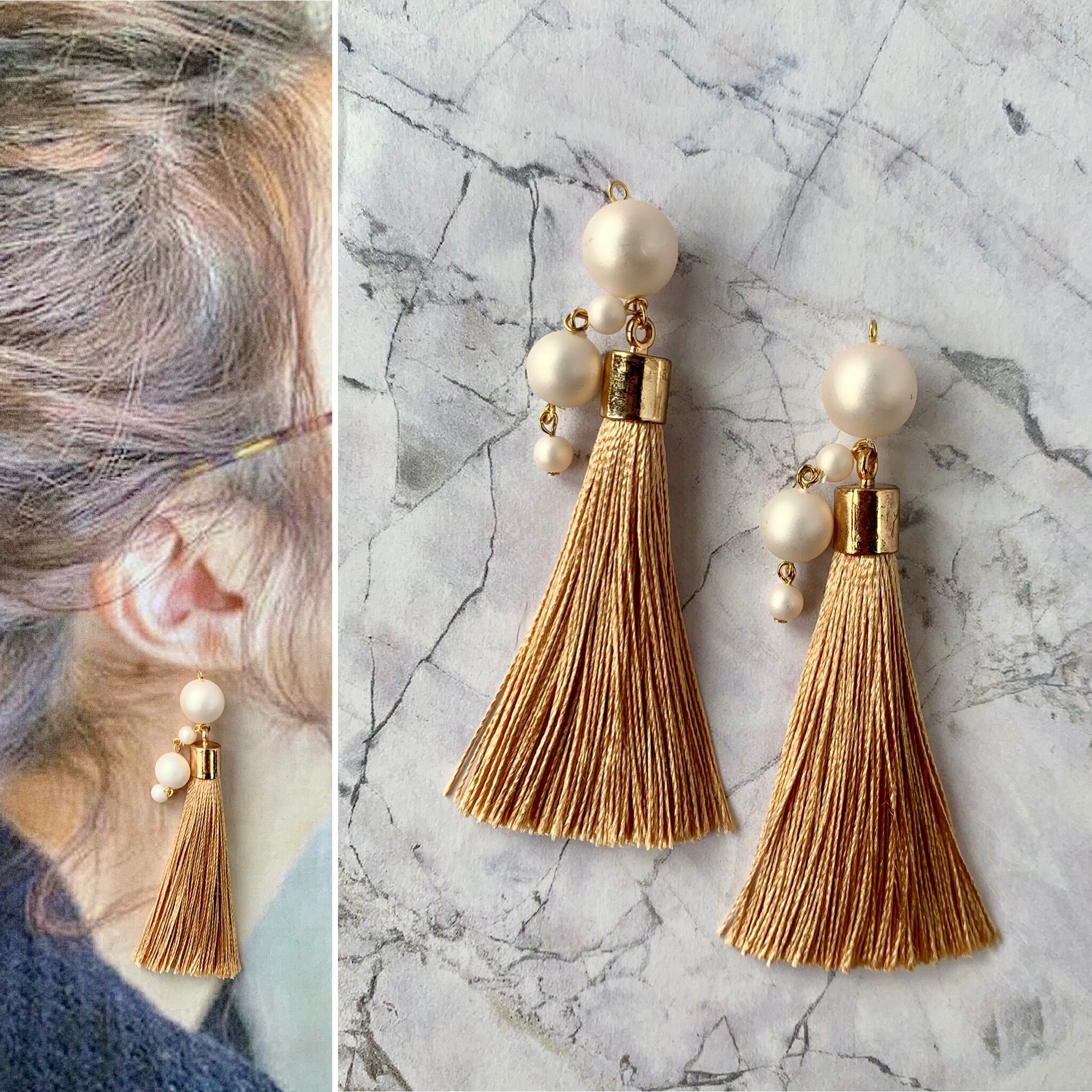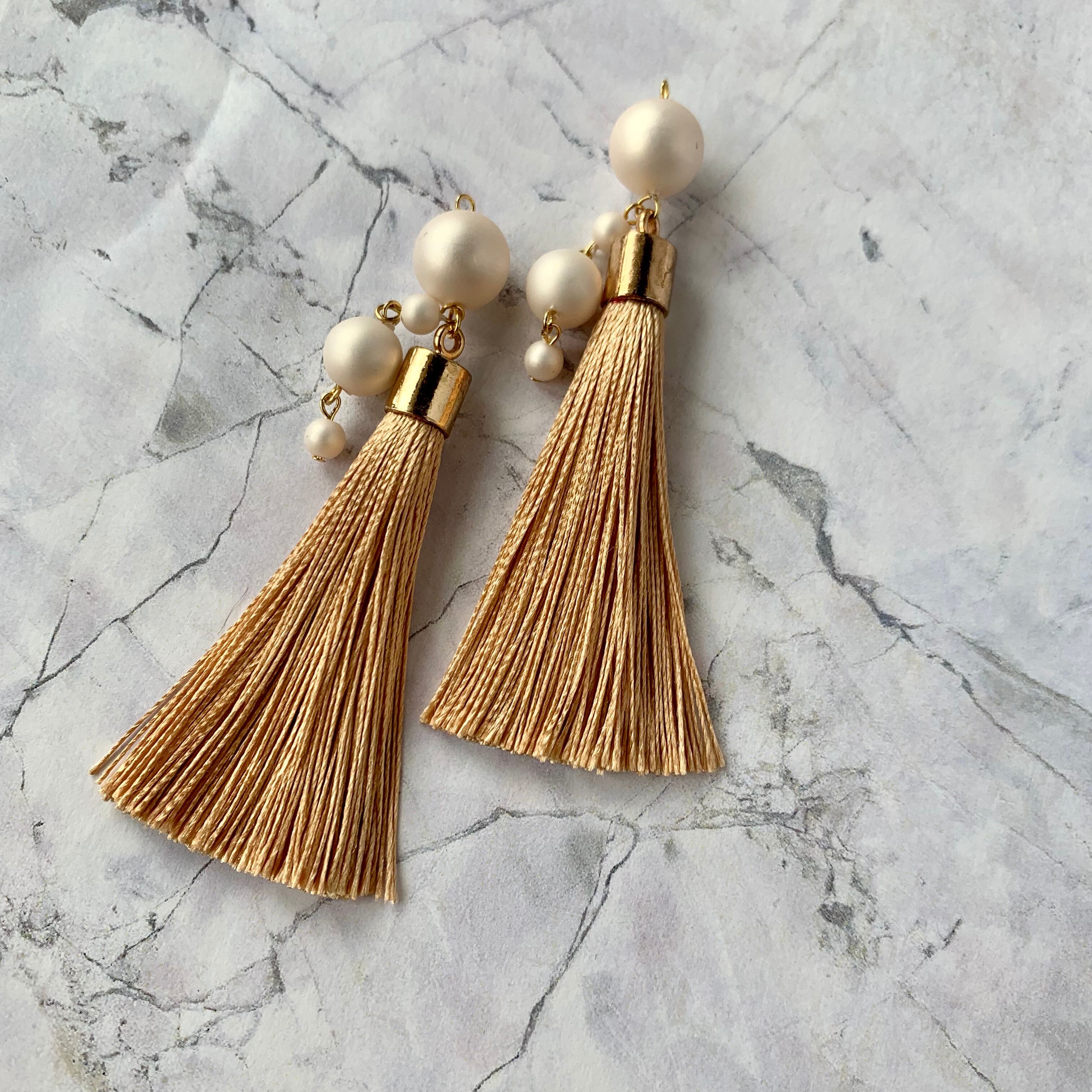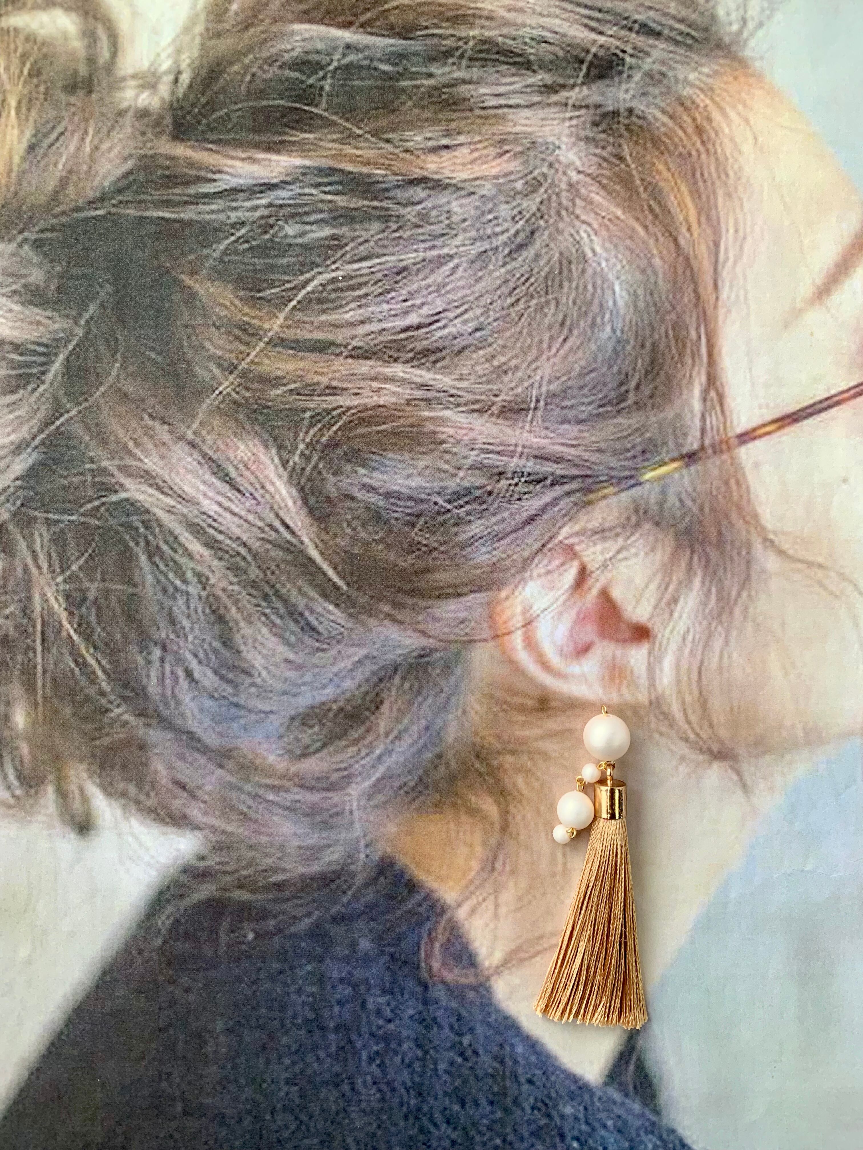 【1点物*】マットパール×上質タッセルピアス ベージュ