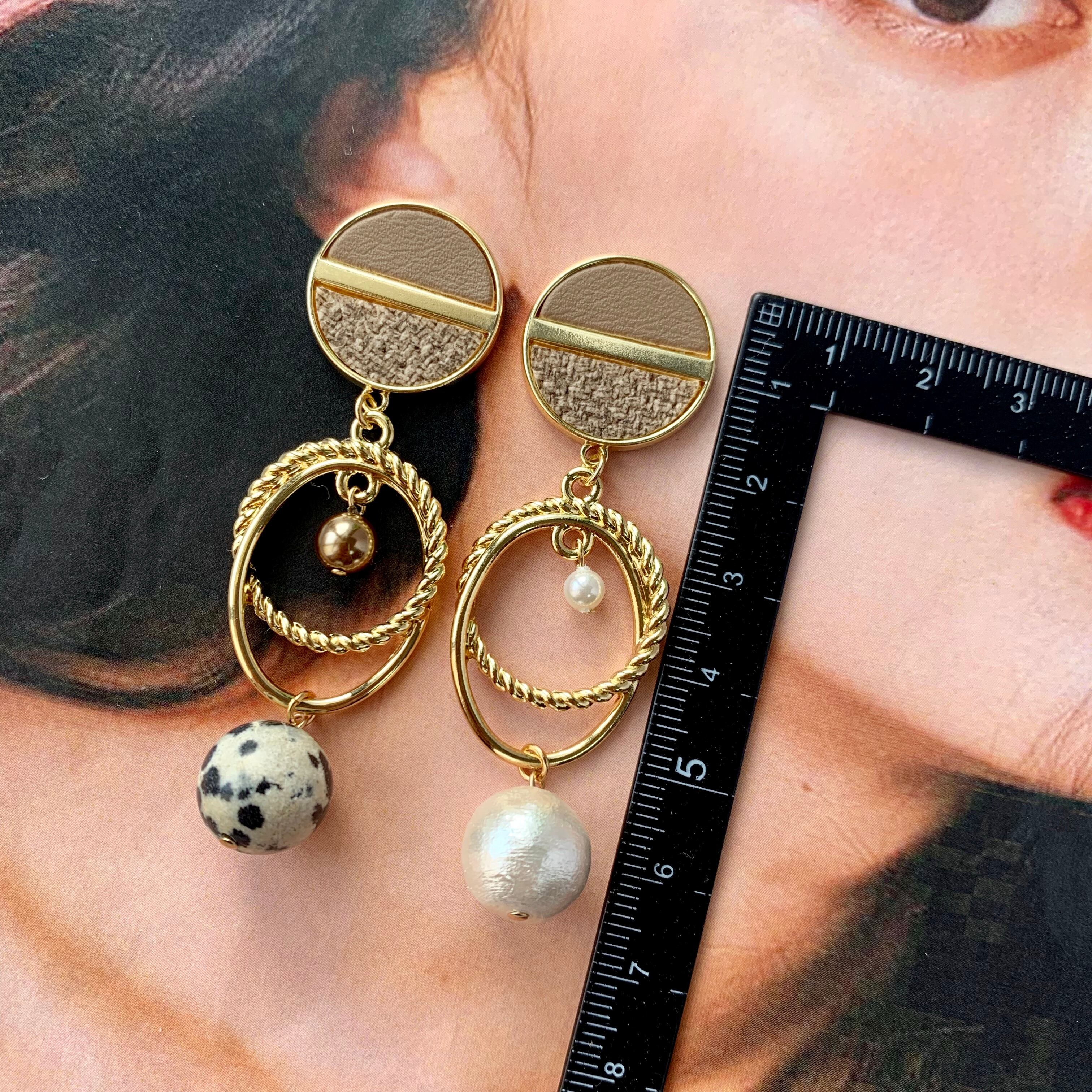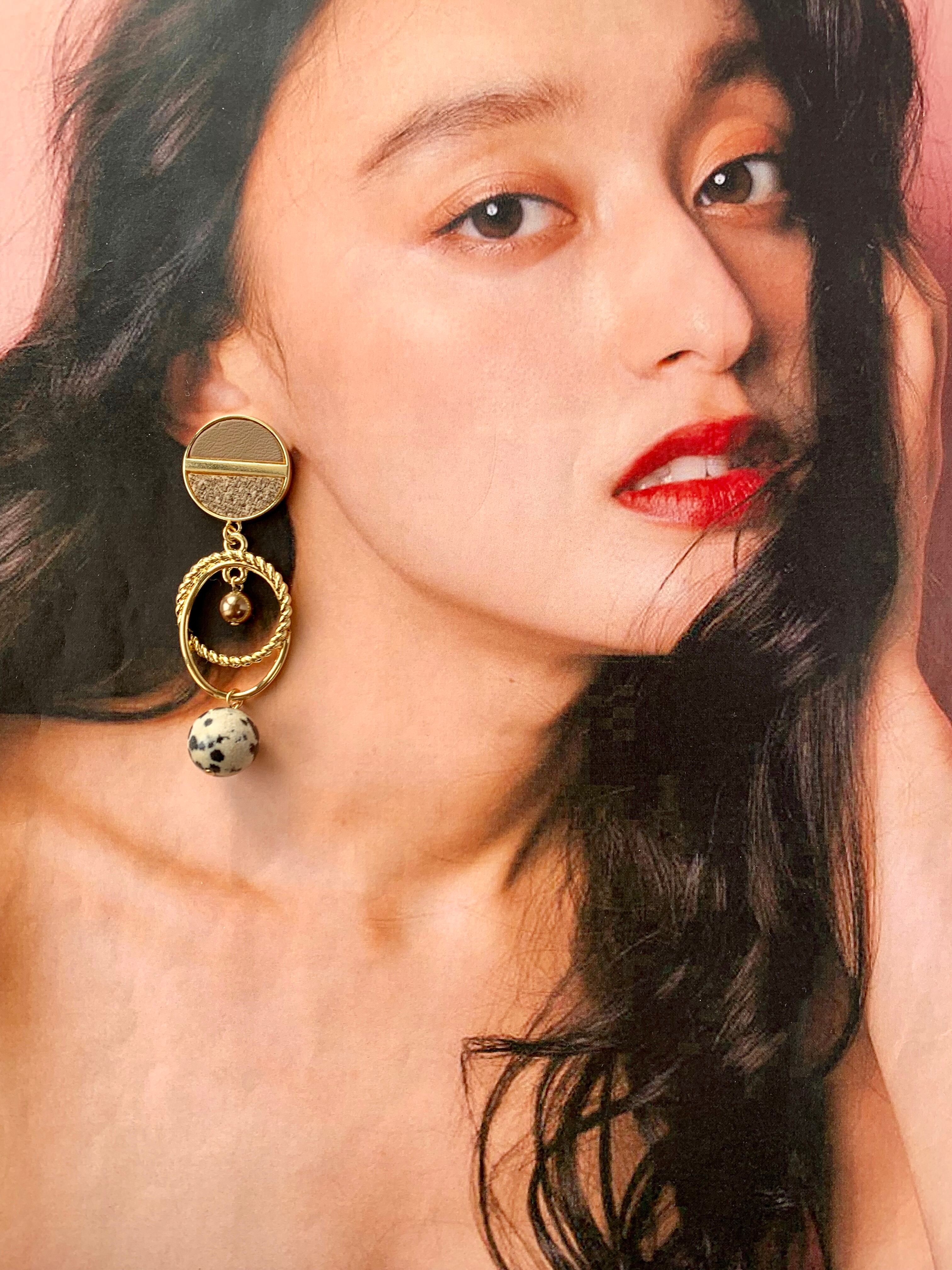 レザー&ツイードハーフカボションアシメピアス キャメル