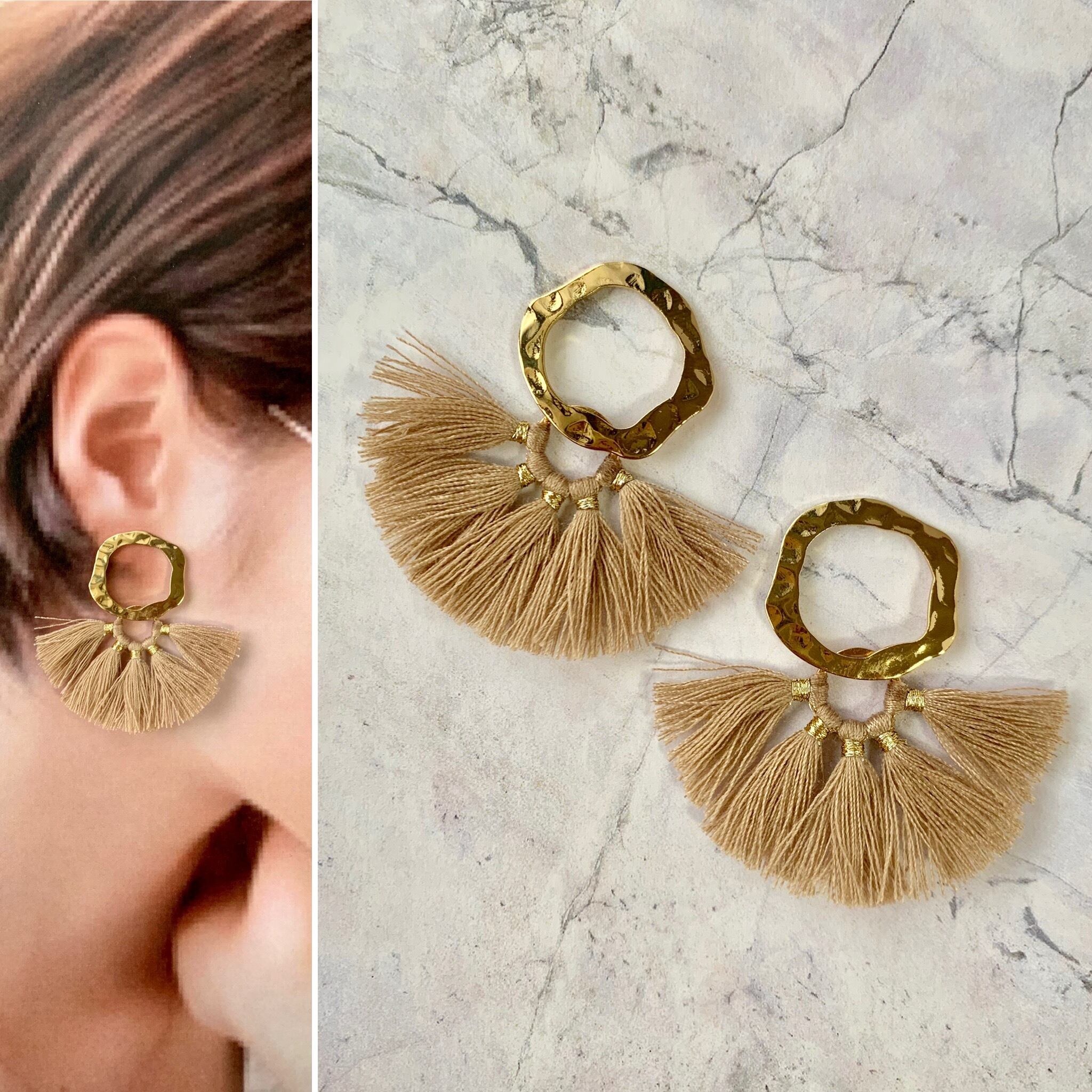 【1点物*】いびつサークル×扇タッセルピアス べージュ