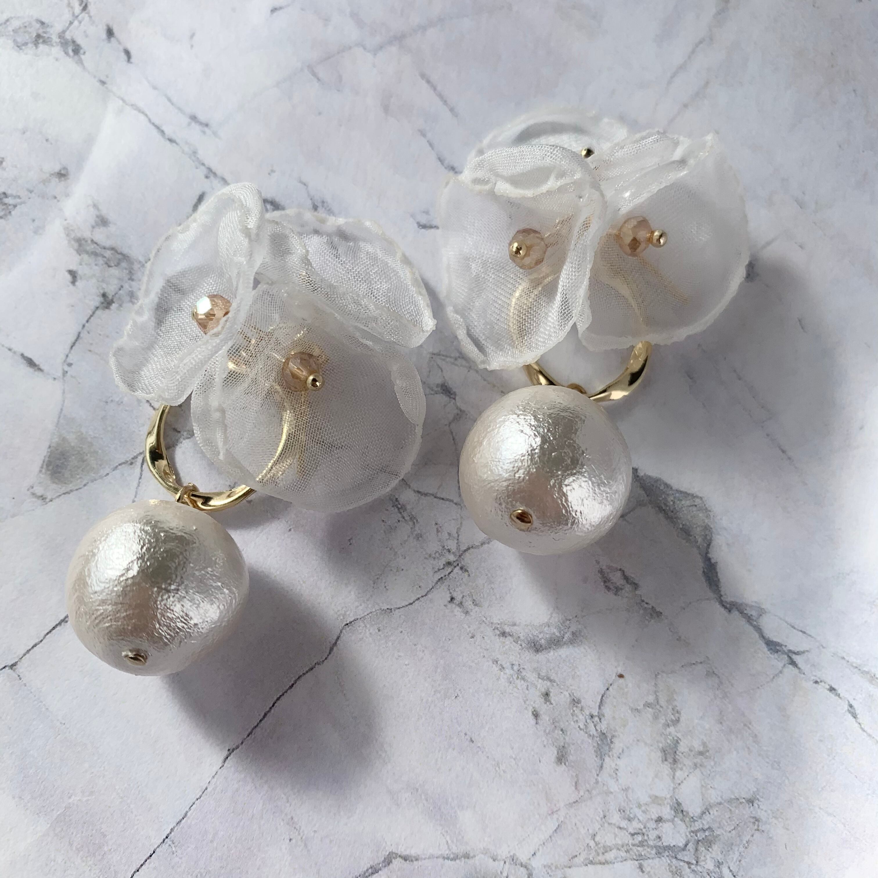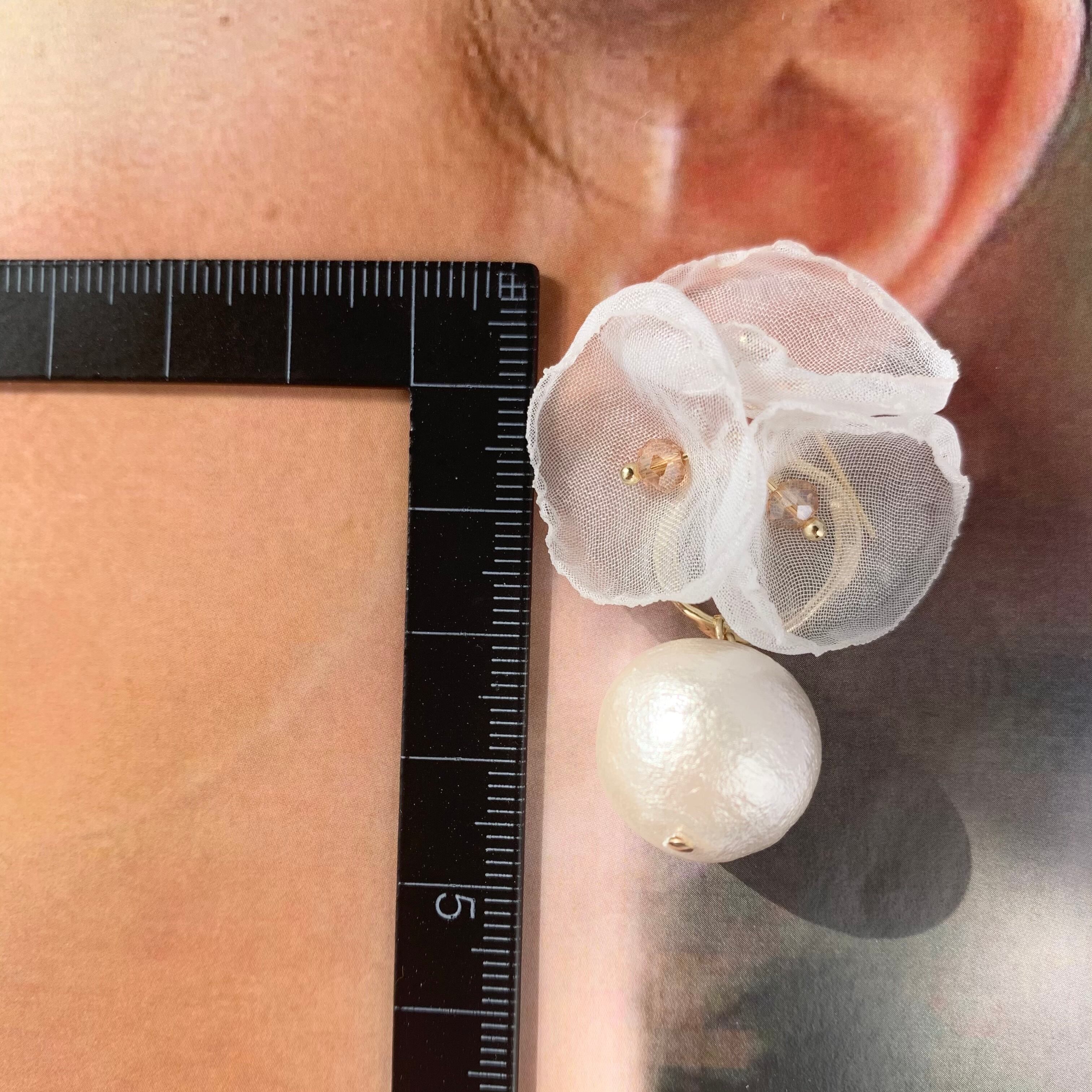 【1点物*】シフォンフラワー×高品質コットンパールピアス ホワイト