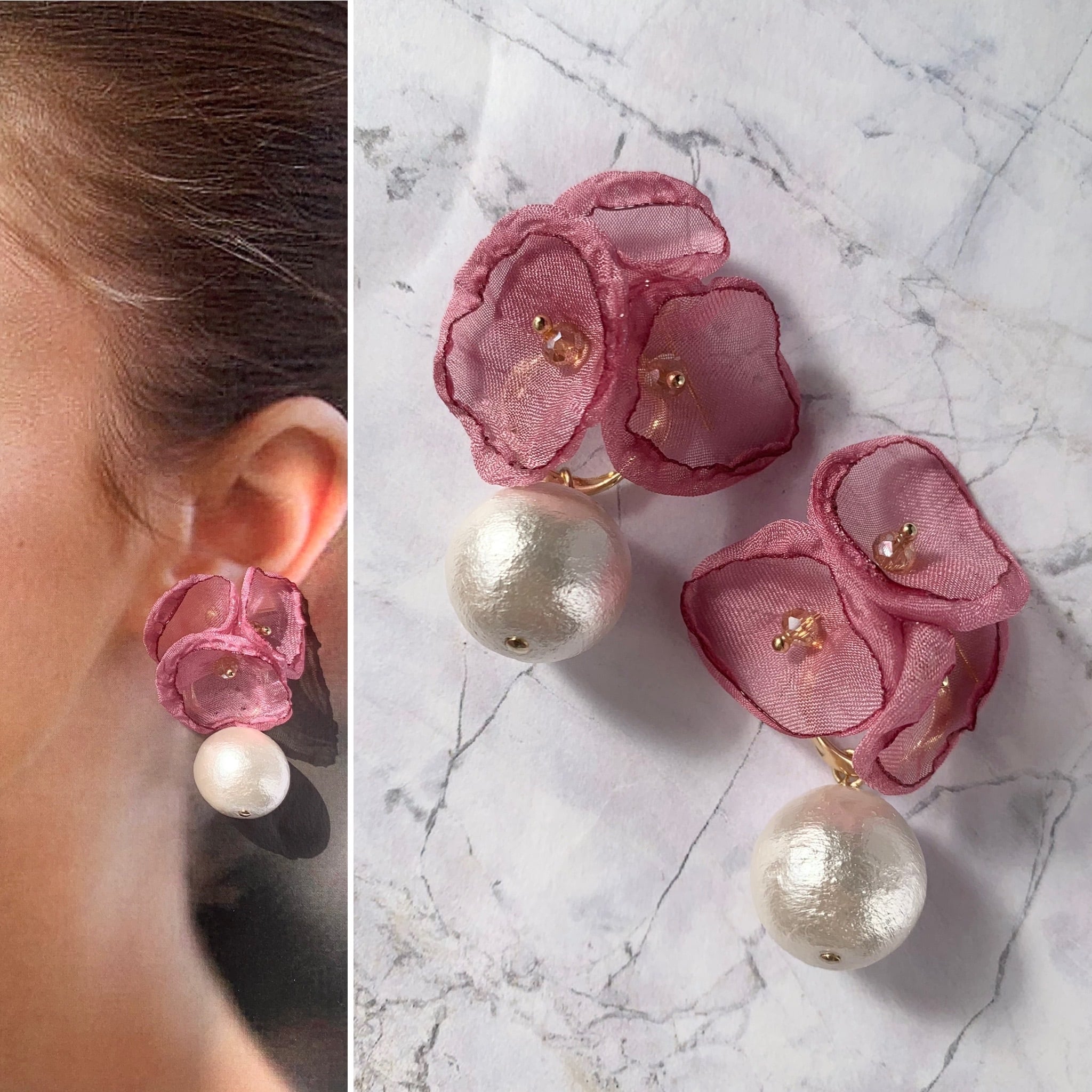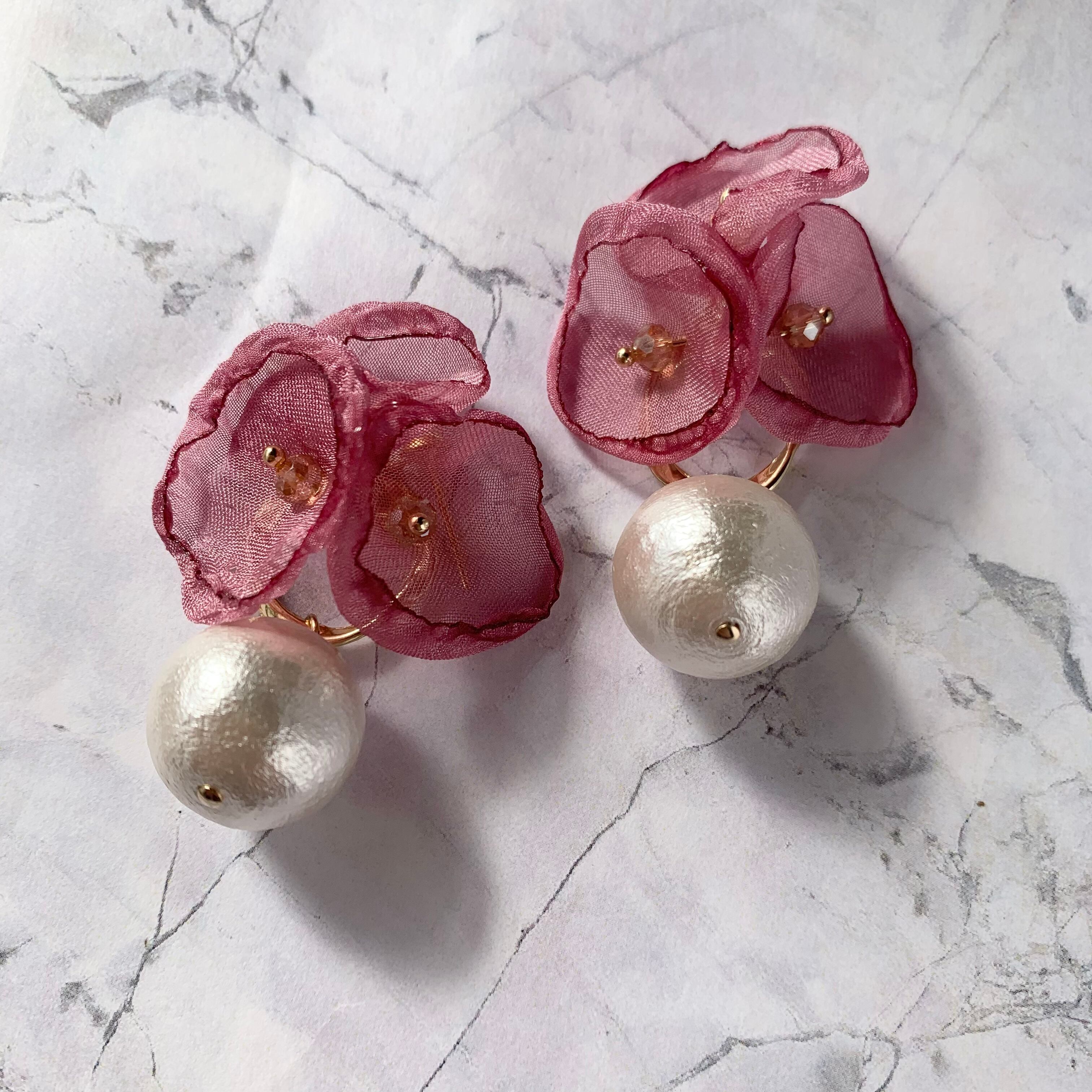 【1点物*】シフォンフラワー×高品質コットンパールピアス ローズ