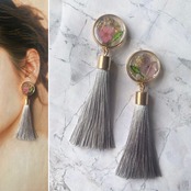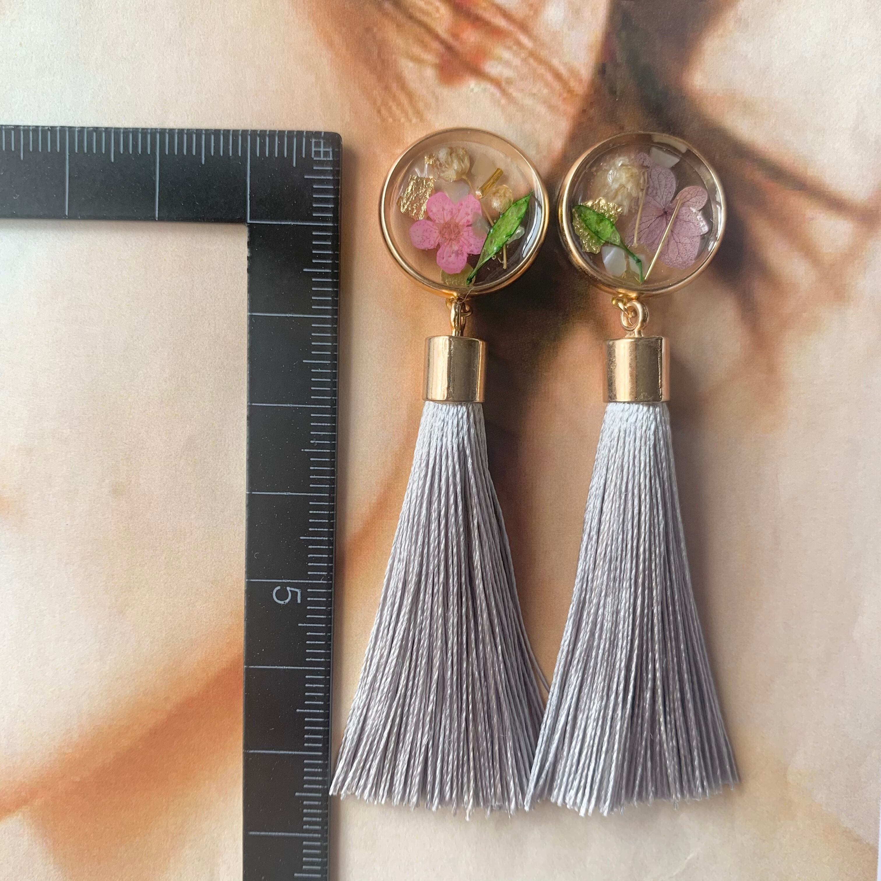 押し花×高品質タッセル ピアス ライトグレー
