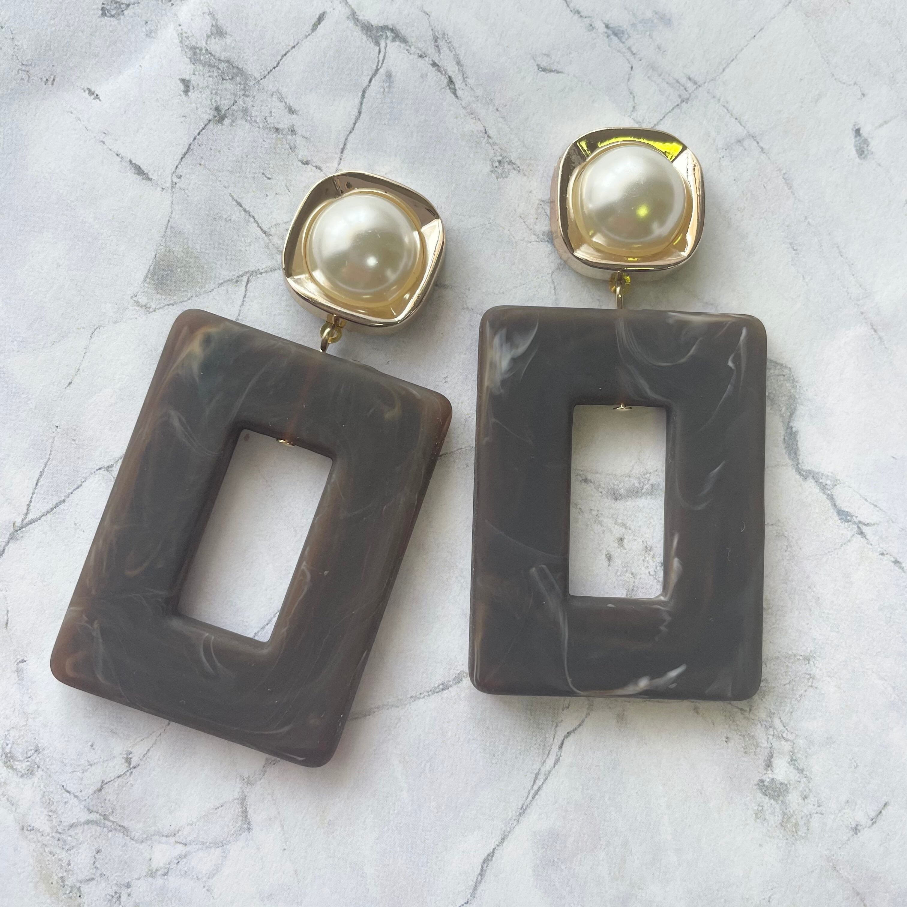 【1点物*】パール×中抜きスクエアマットピアス チャコール