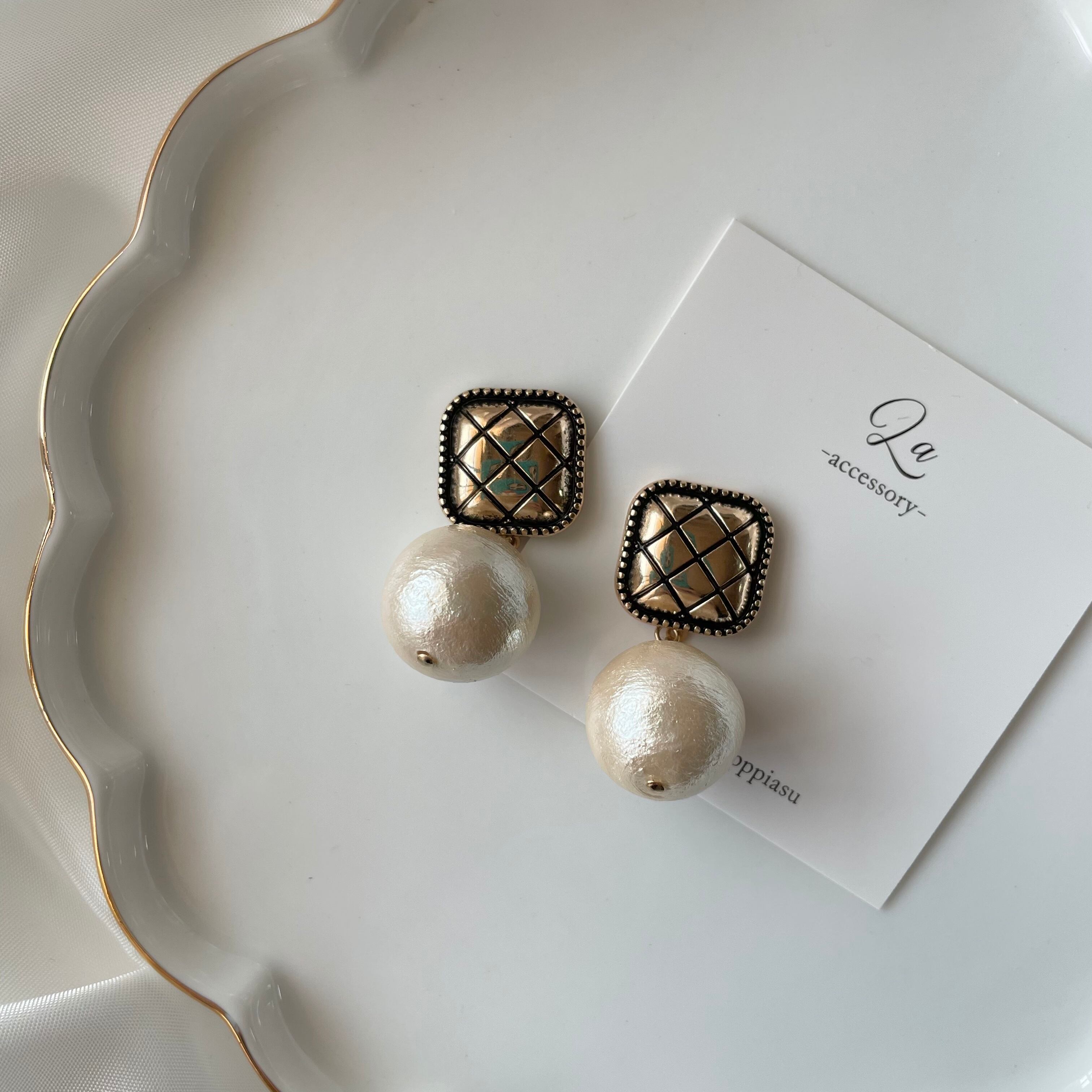 キルティング風×高品質コットンパールピアス ショートタイプ