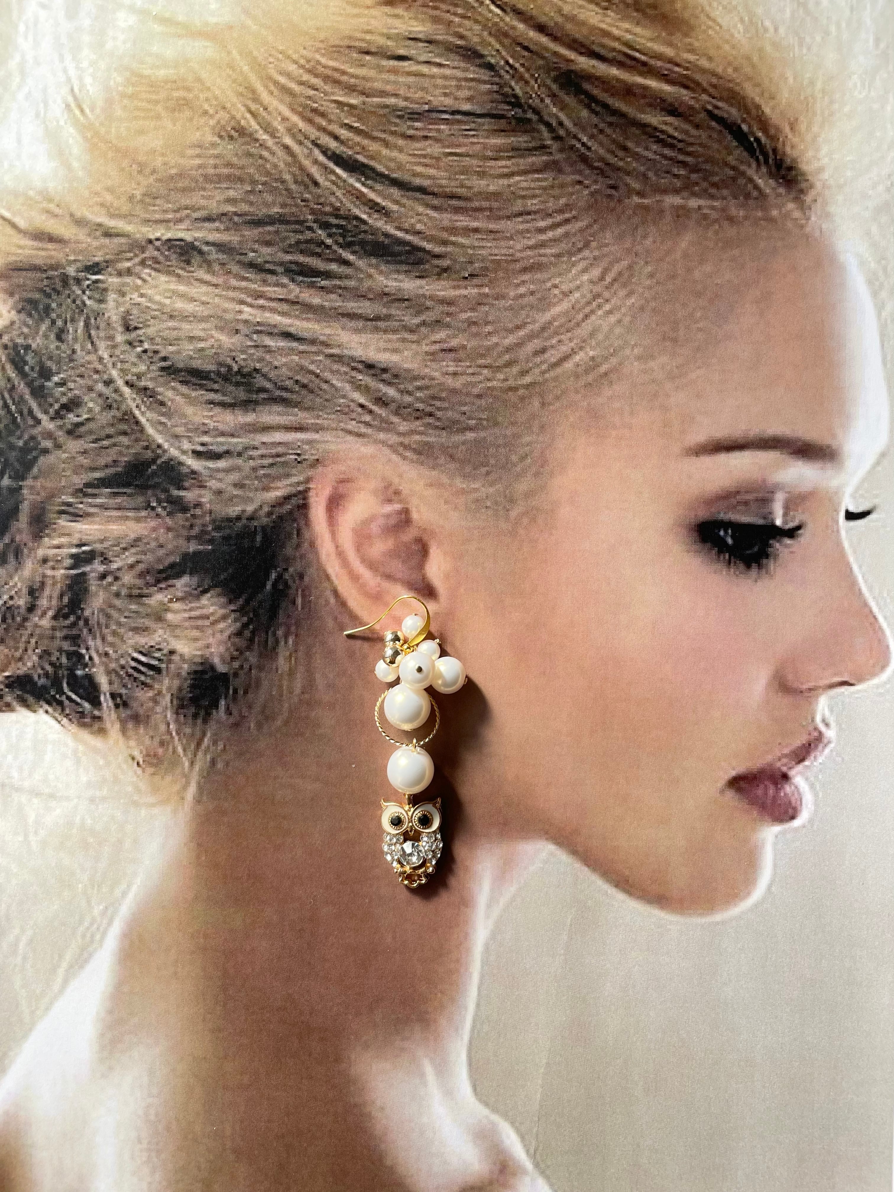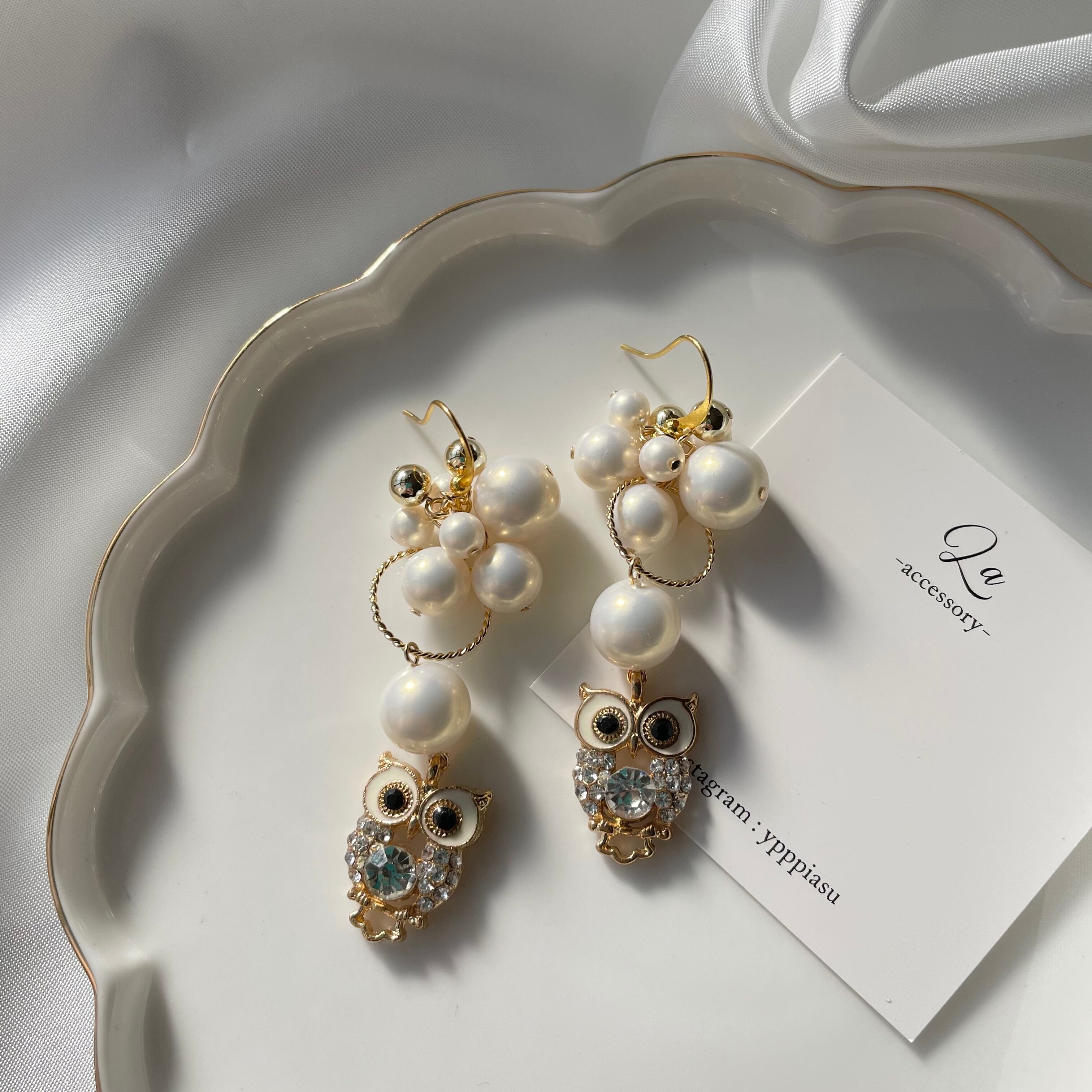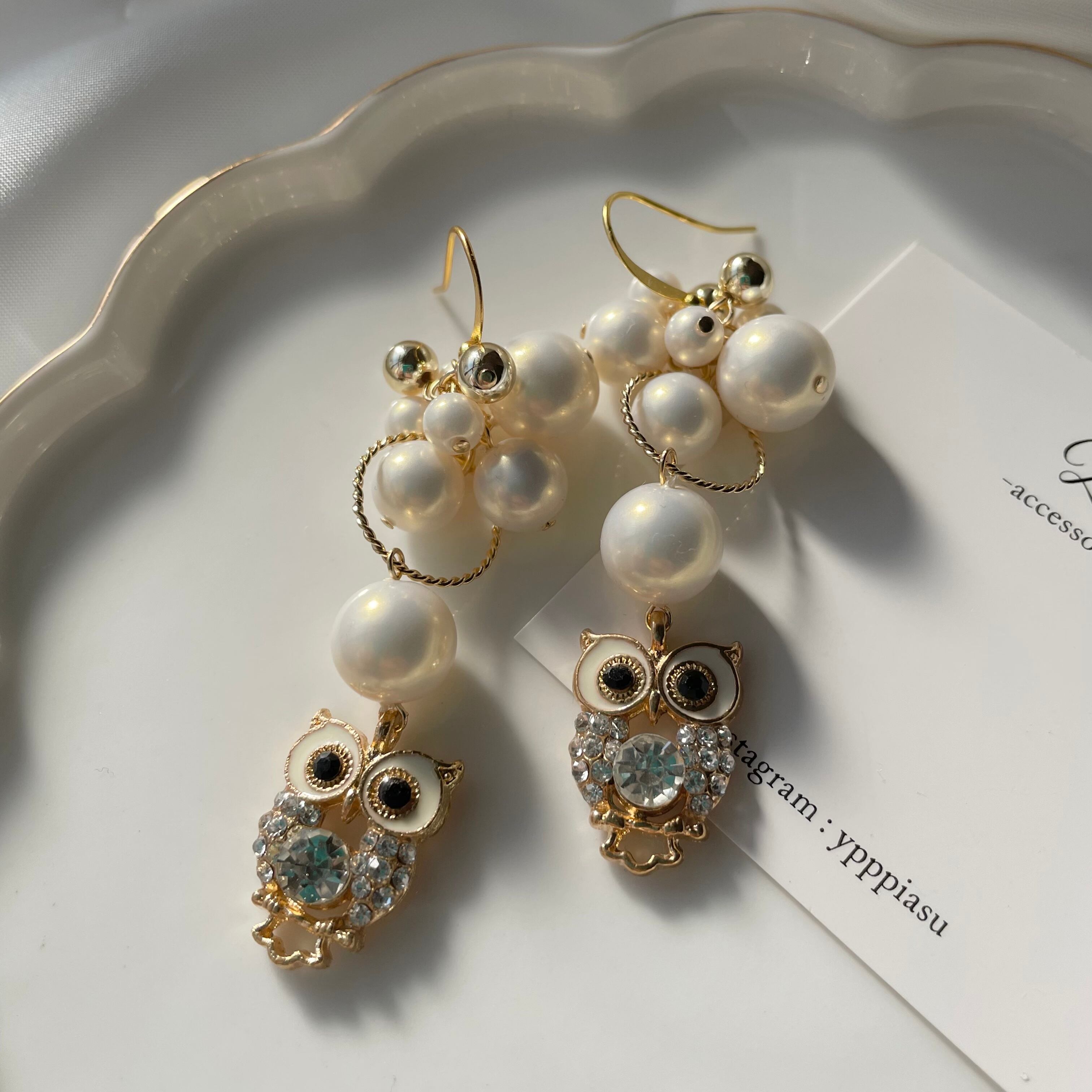 フクロウさん×スノーホワイトじゃらじゃらピアス 新色のパールカラーです ∗︎*゚
