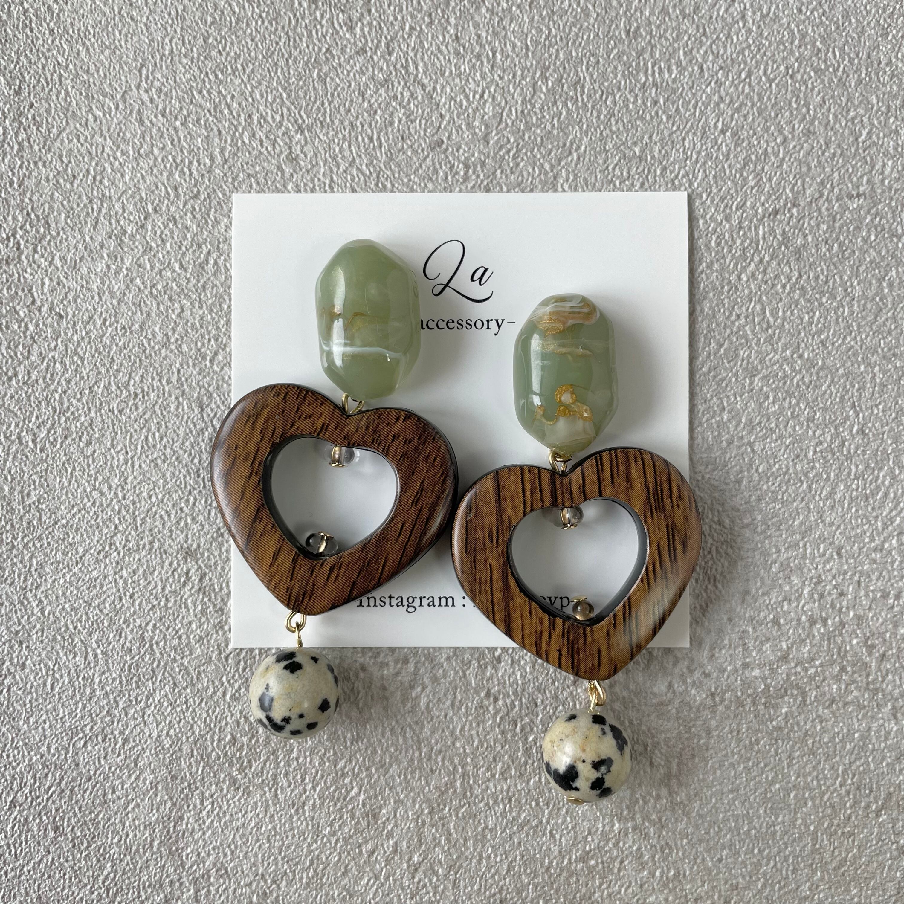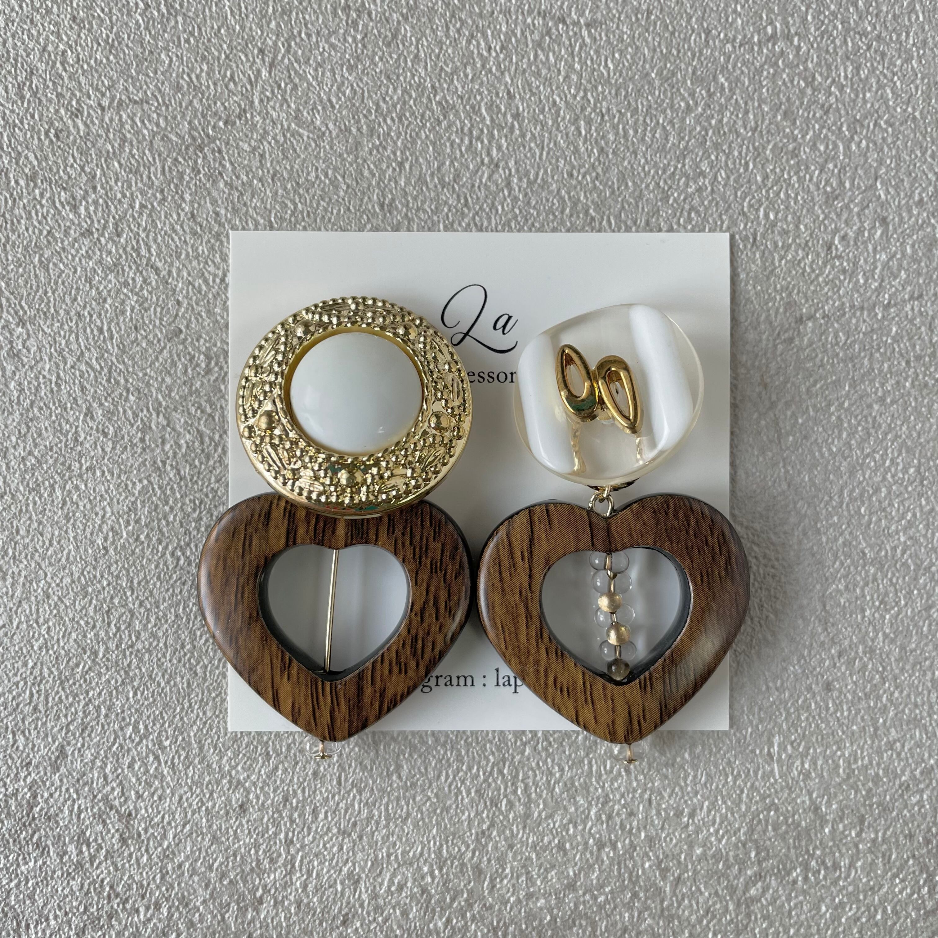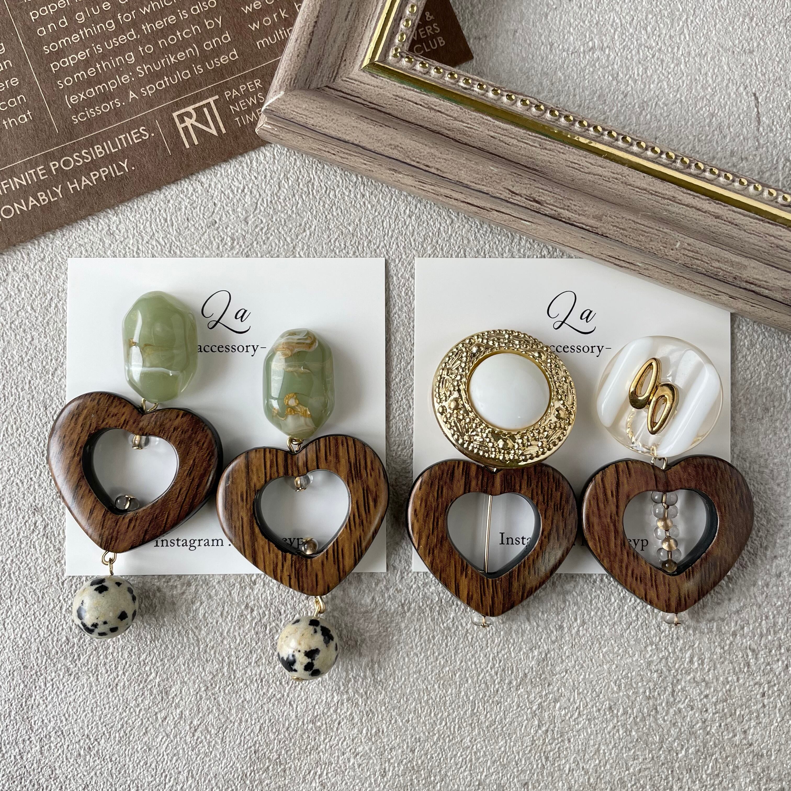 【ピアスのみ 樹脂可*】アンティークスタイルウッドハートピアス