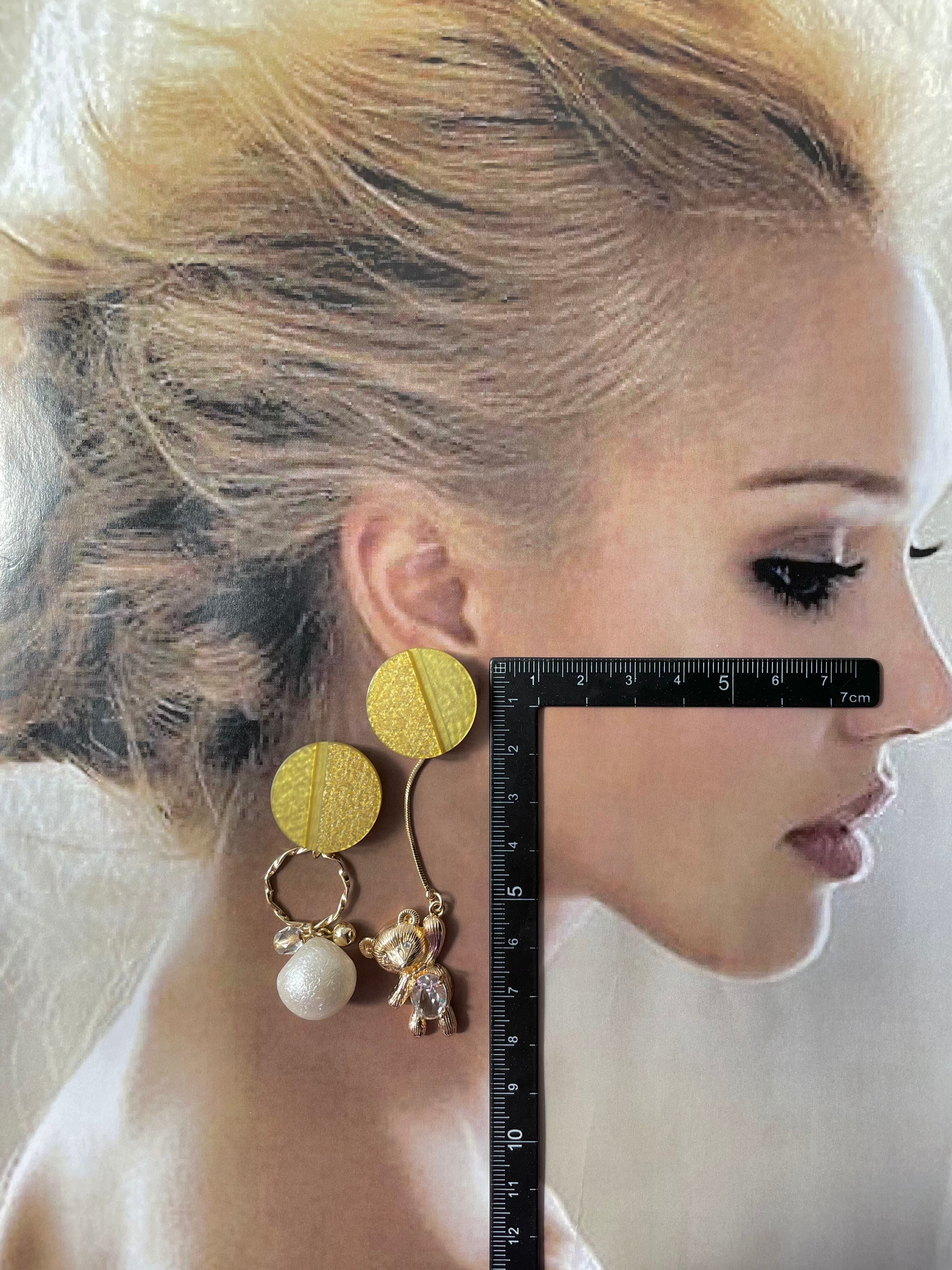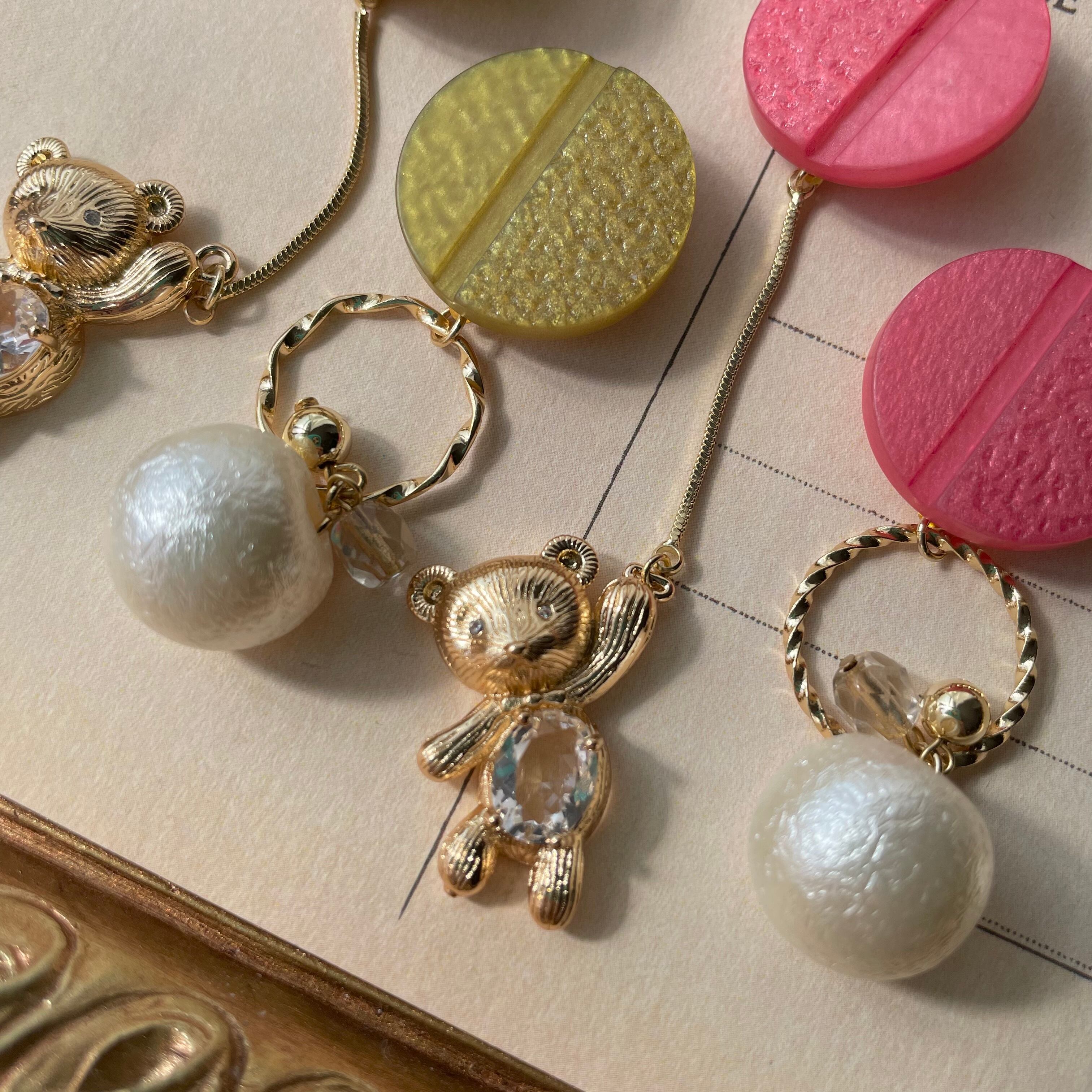 【ピアスのみ 樹脂可*】 アンティークボタン×ぶら下がりくまさんピアス