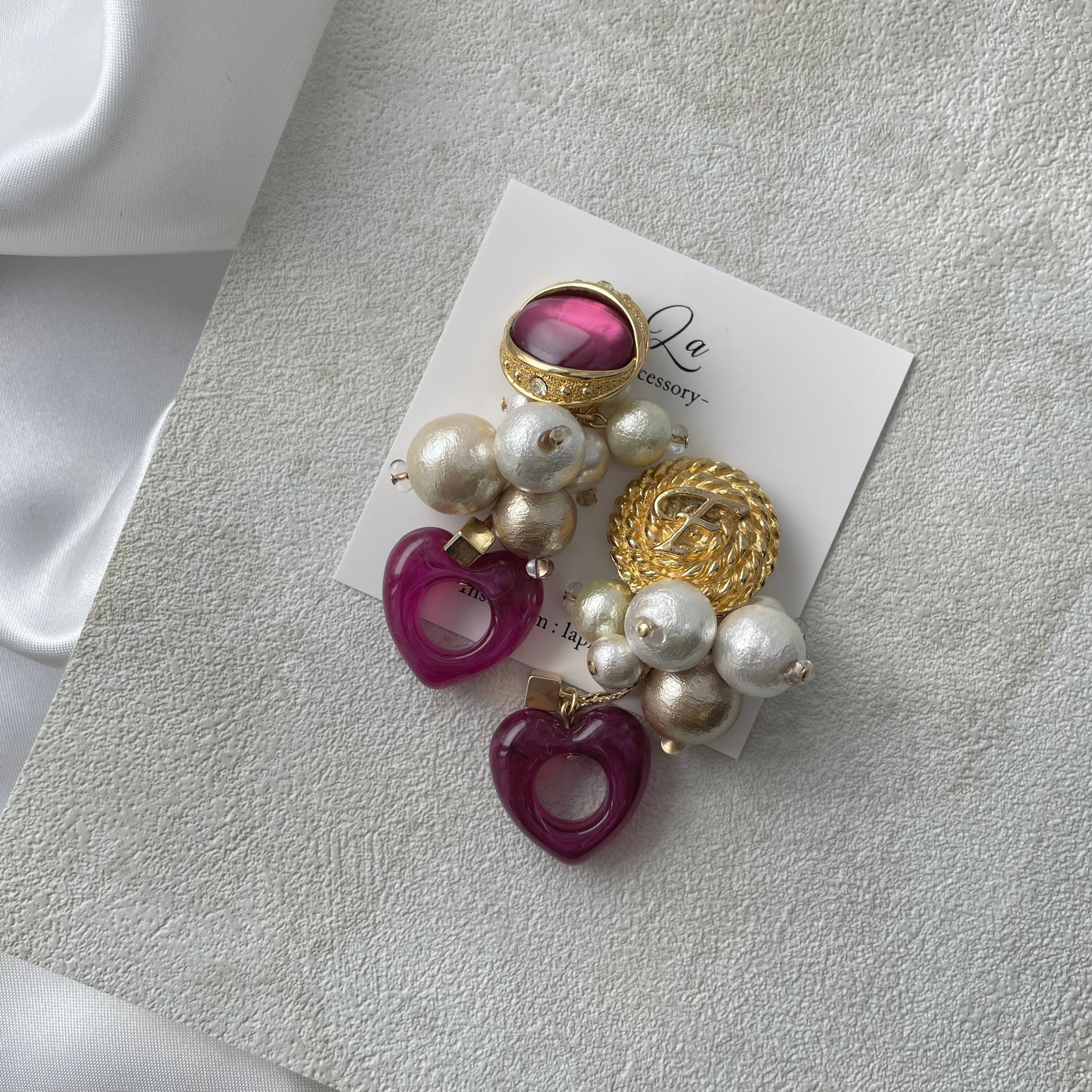 【1点物*ピアスのみ】アシメヴィンテージボタン×ローズピンクピアス