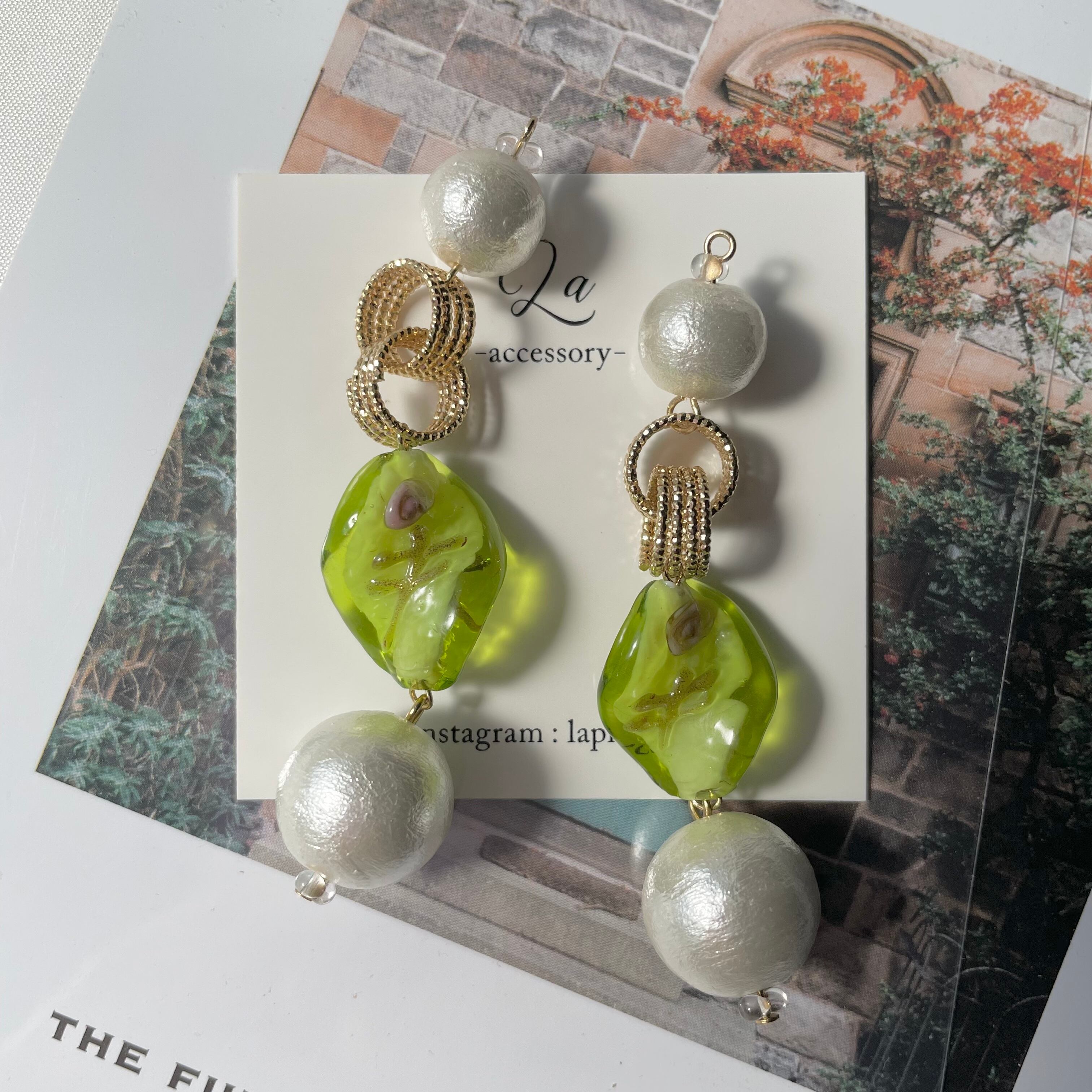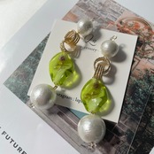 【1点物*】高品質コットンパール×黄緑ガラスパーツピアス
