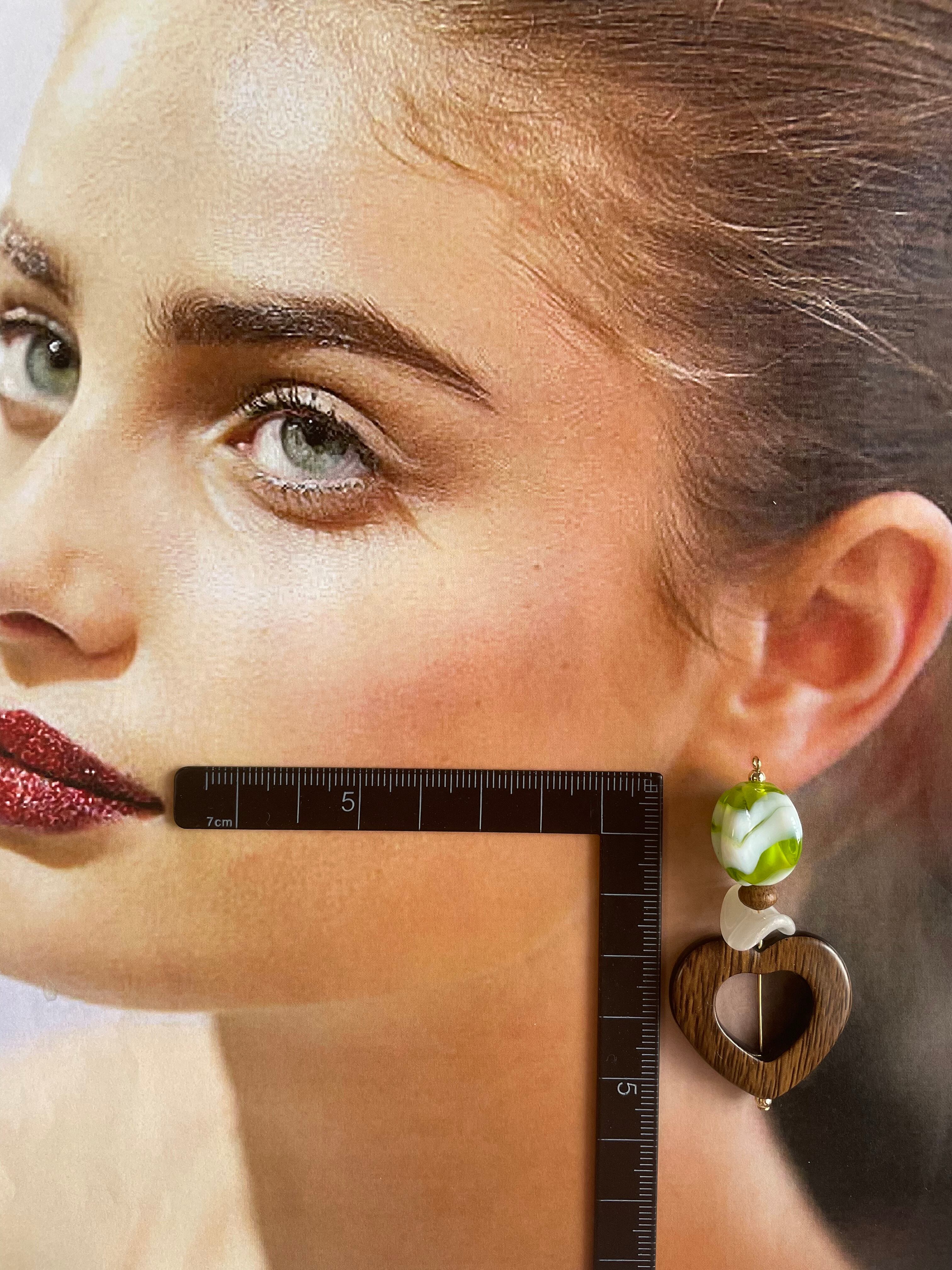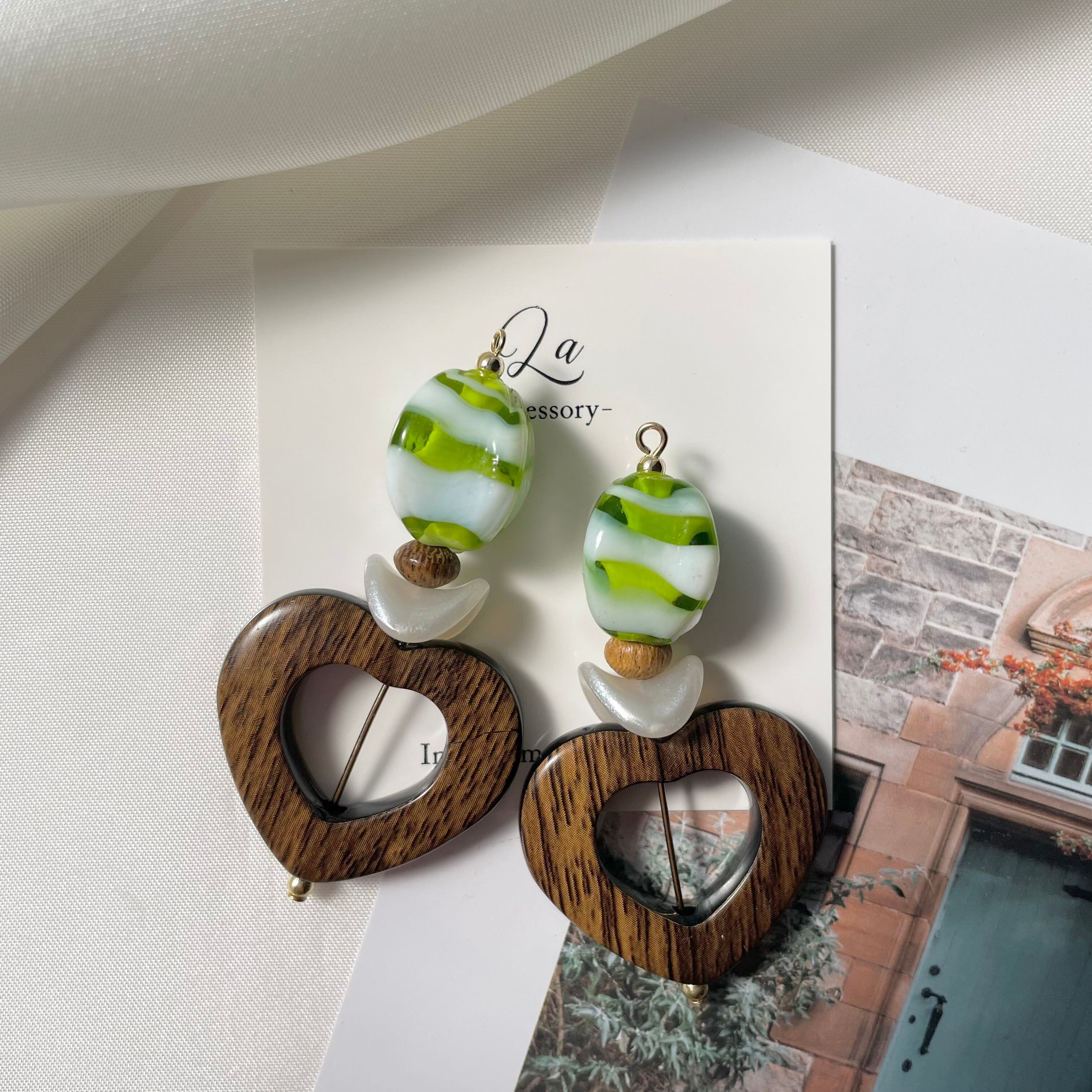 【1点物*】ハートウッド×黄緑ガラスパーツピアス