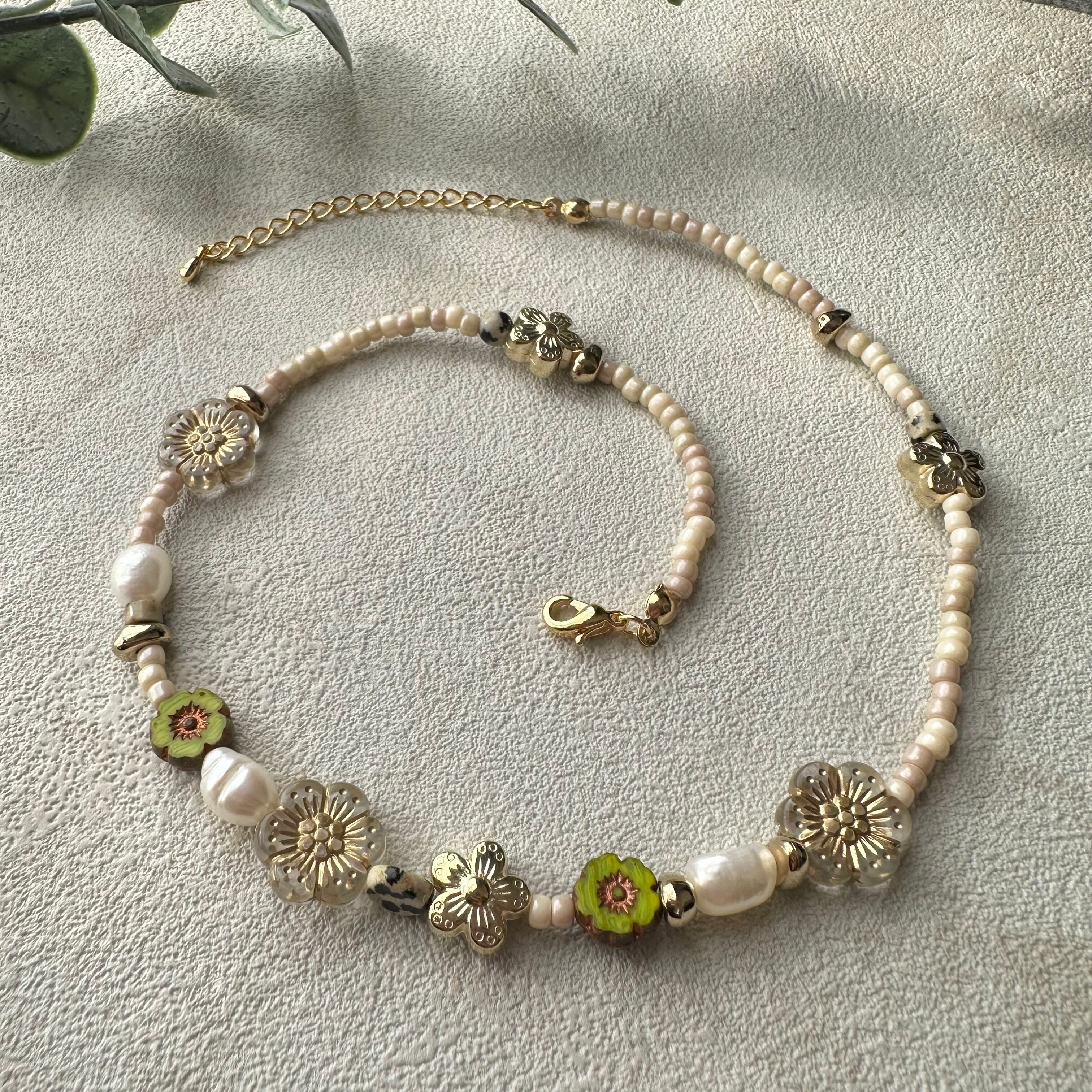 ポイントはピスタチオカラーのヴィンテージビーズ♡天然淡水パールも使用しています♡