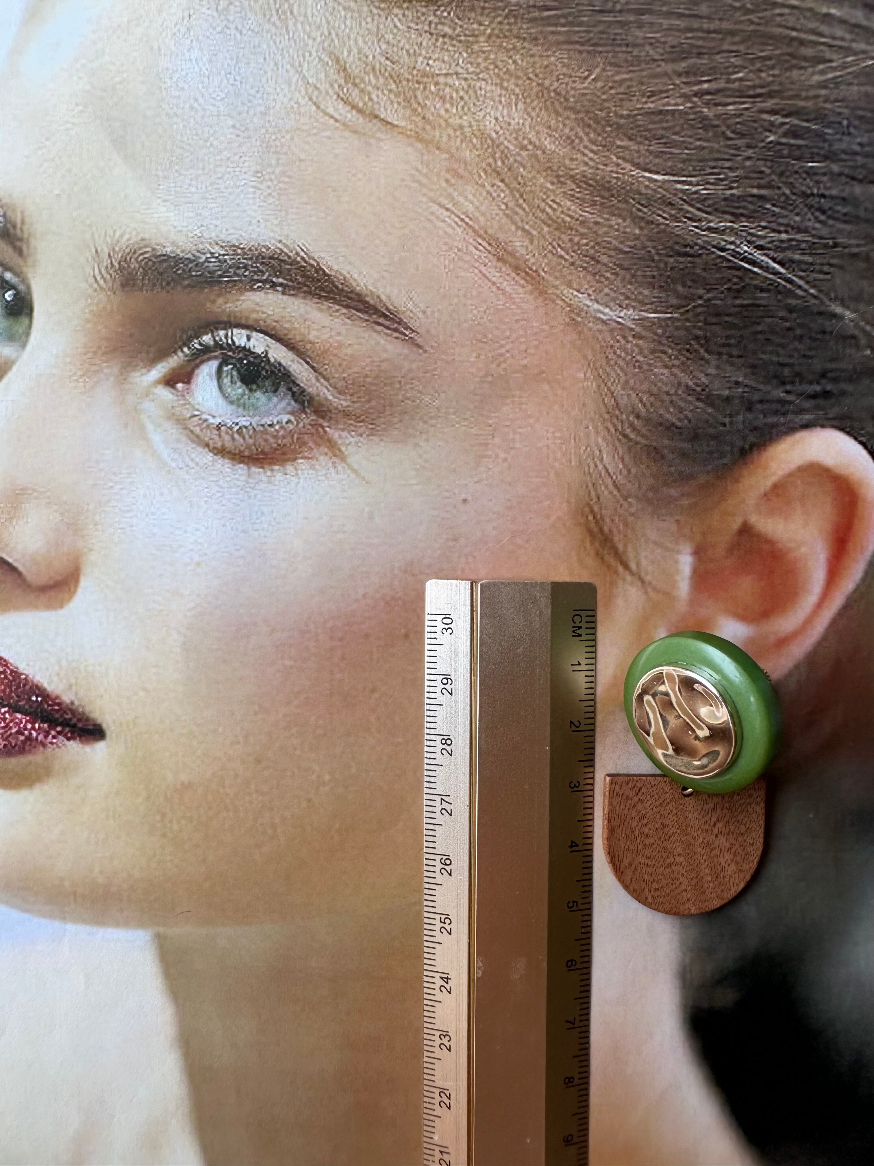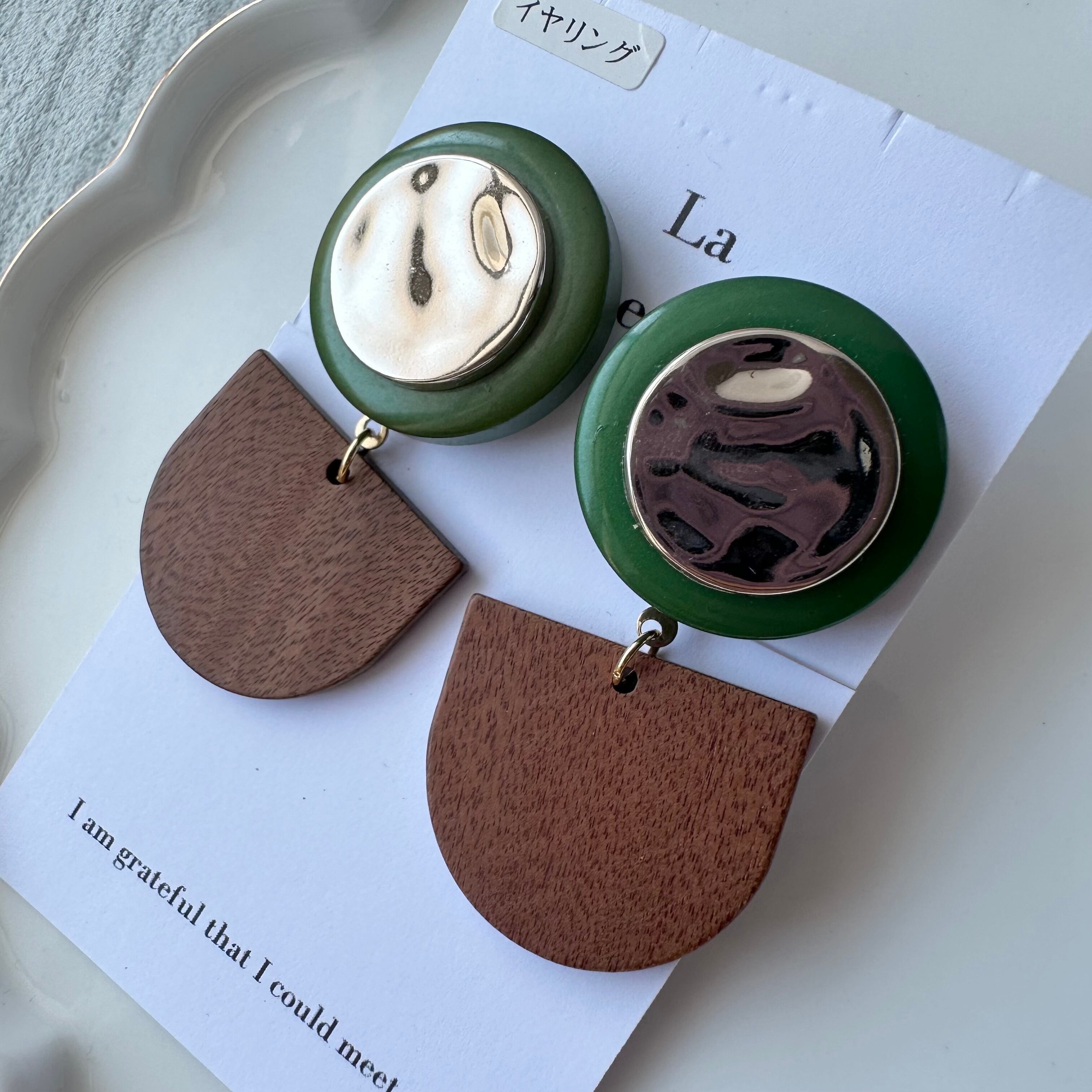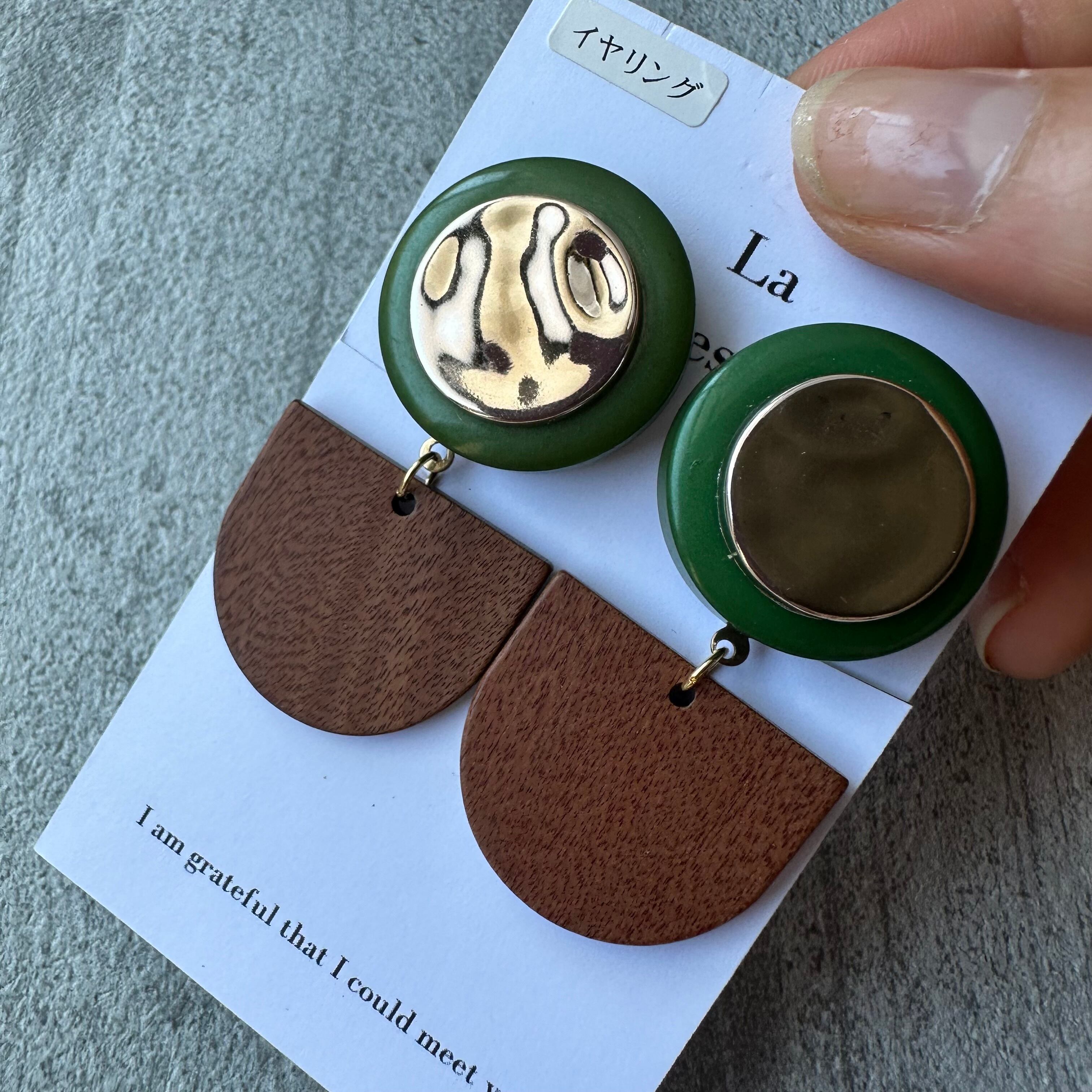 ︎【1点物*】グリーンカボション×変形ウッドピアス