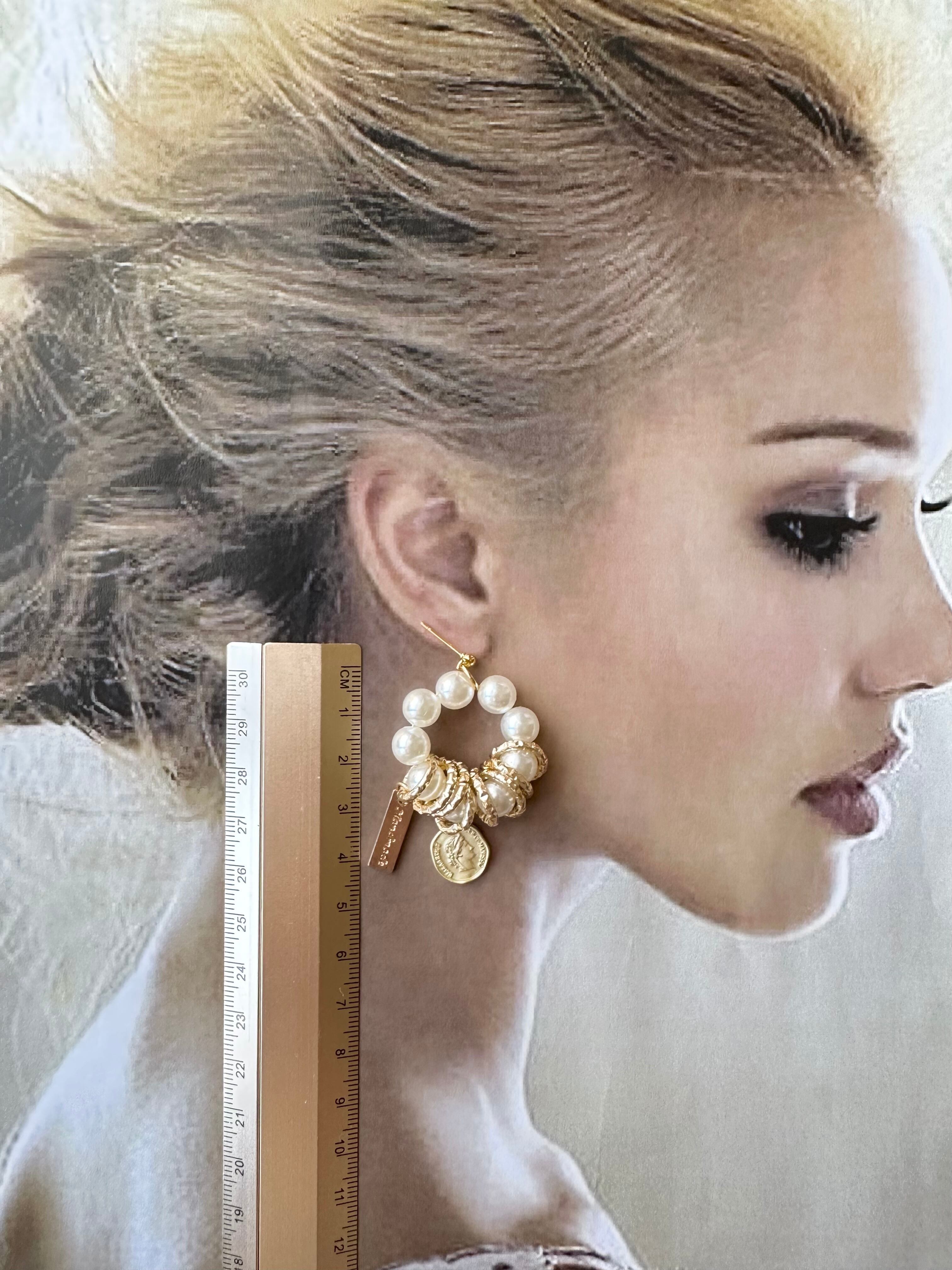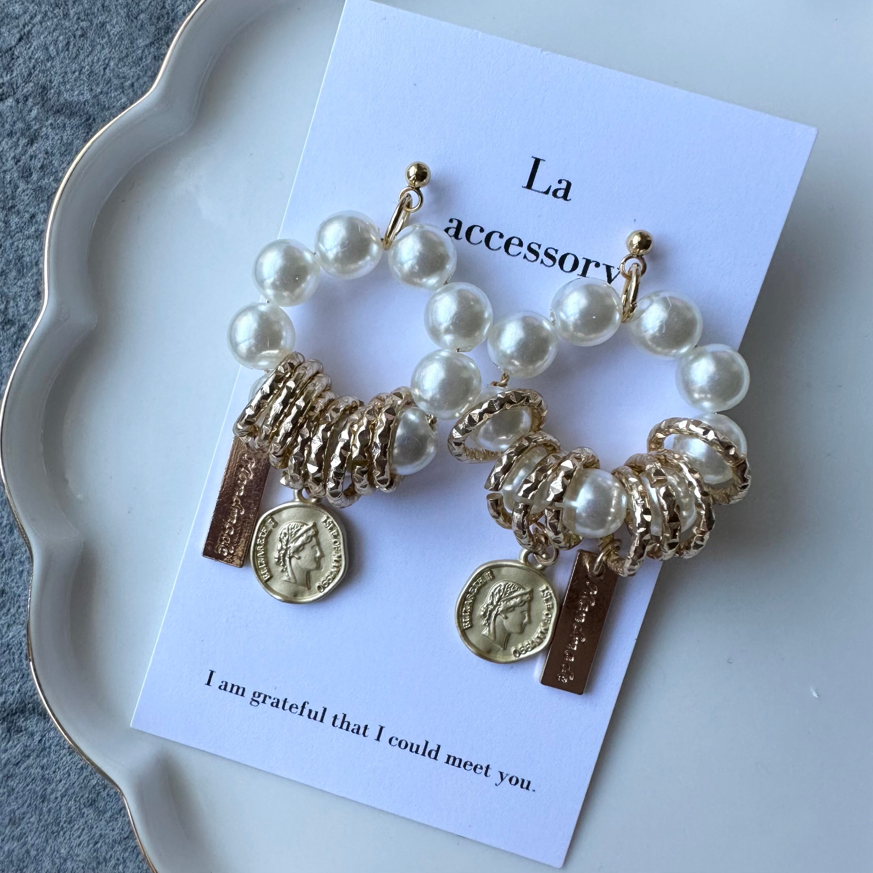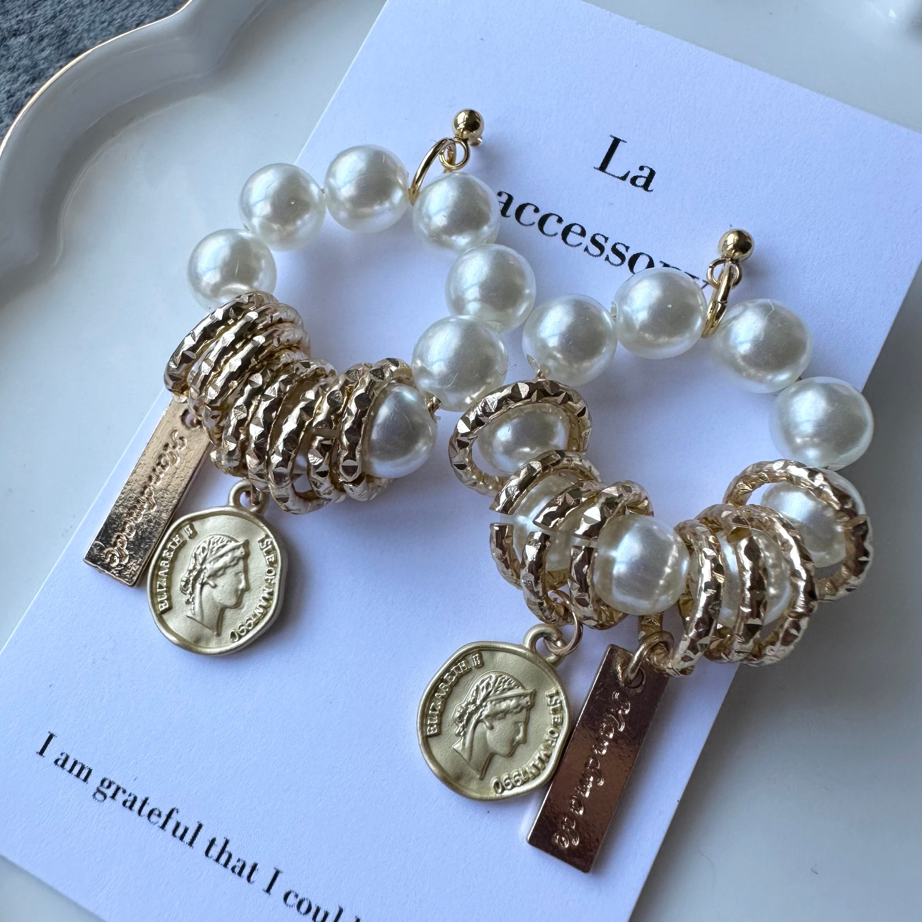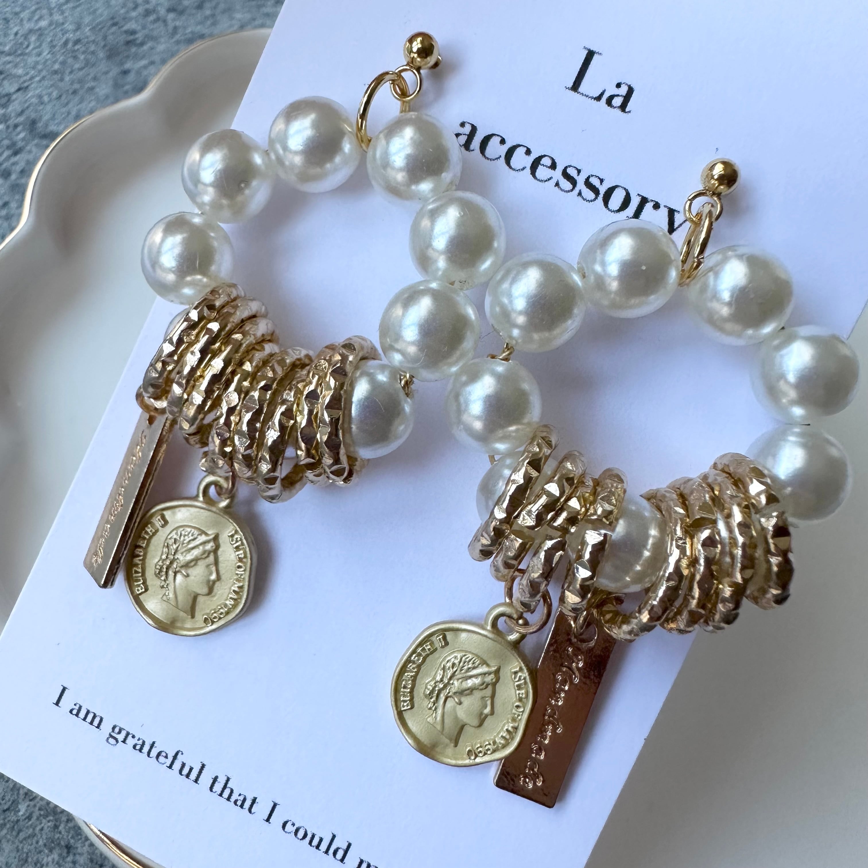 パールフープにアンティークパーツを沢山取り付けて、存在感抜群のピアスです♡