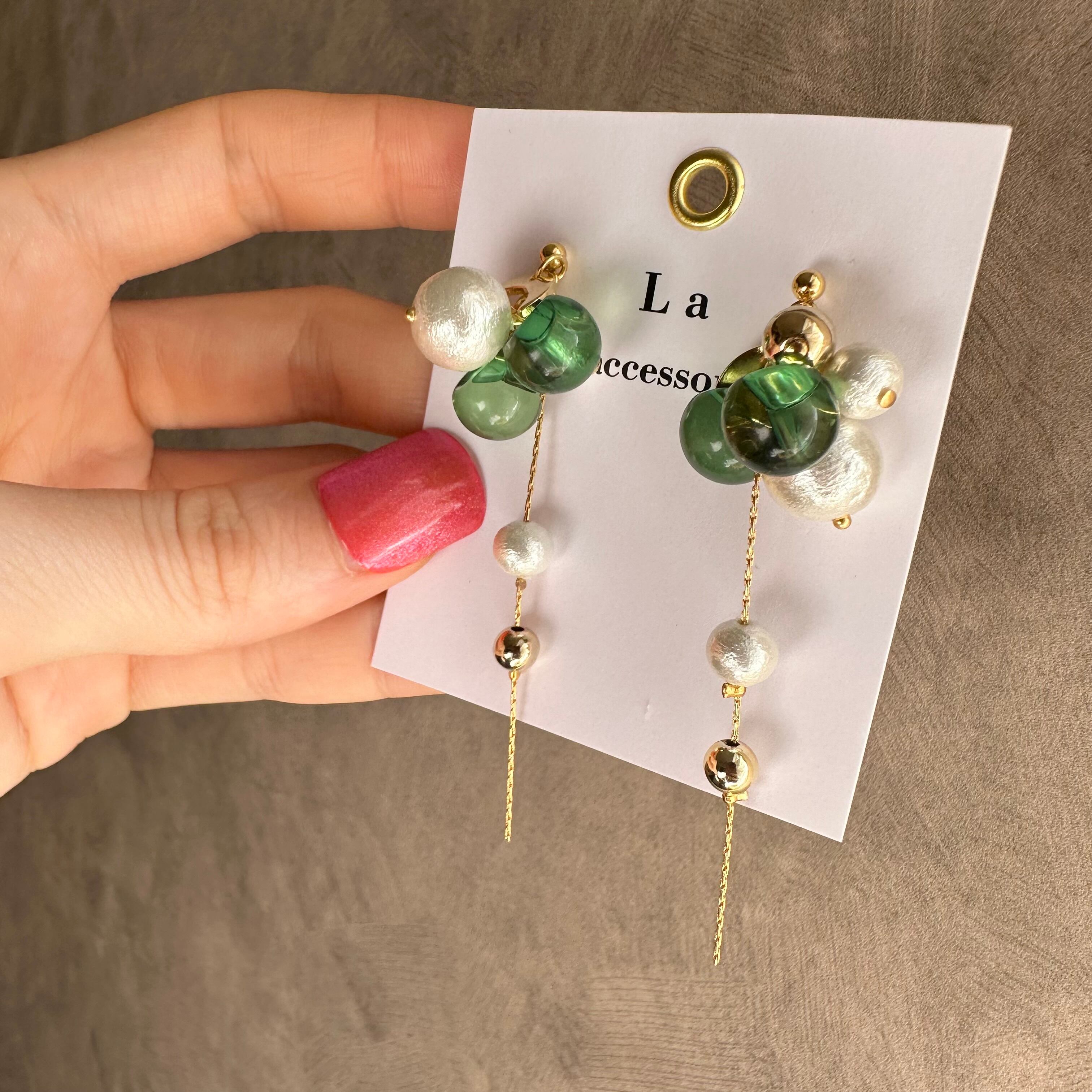 ホワイトコットンパール、ムーンチャーム、グリーン鈴丸を使用。フォルムがとっても可愛いです♡