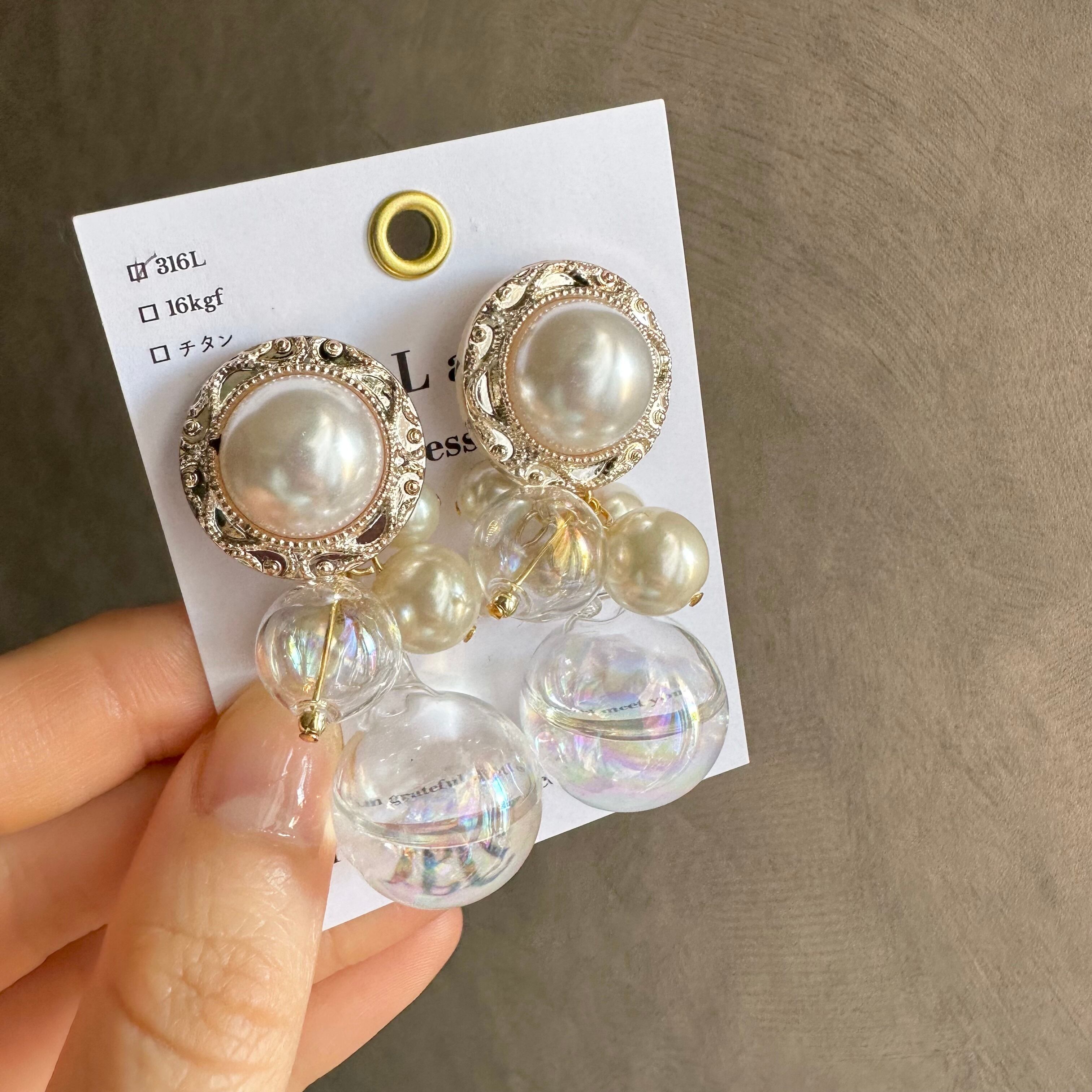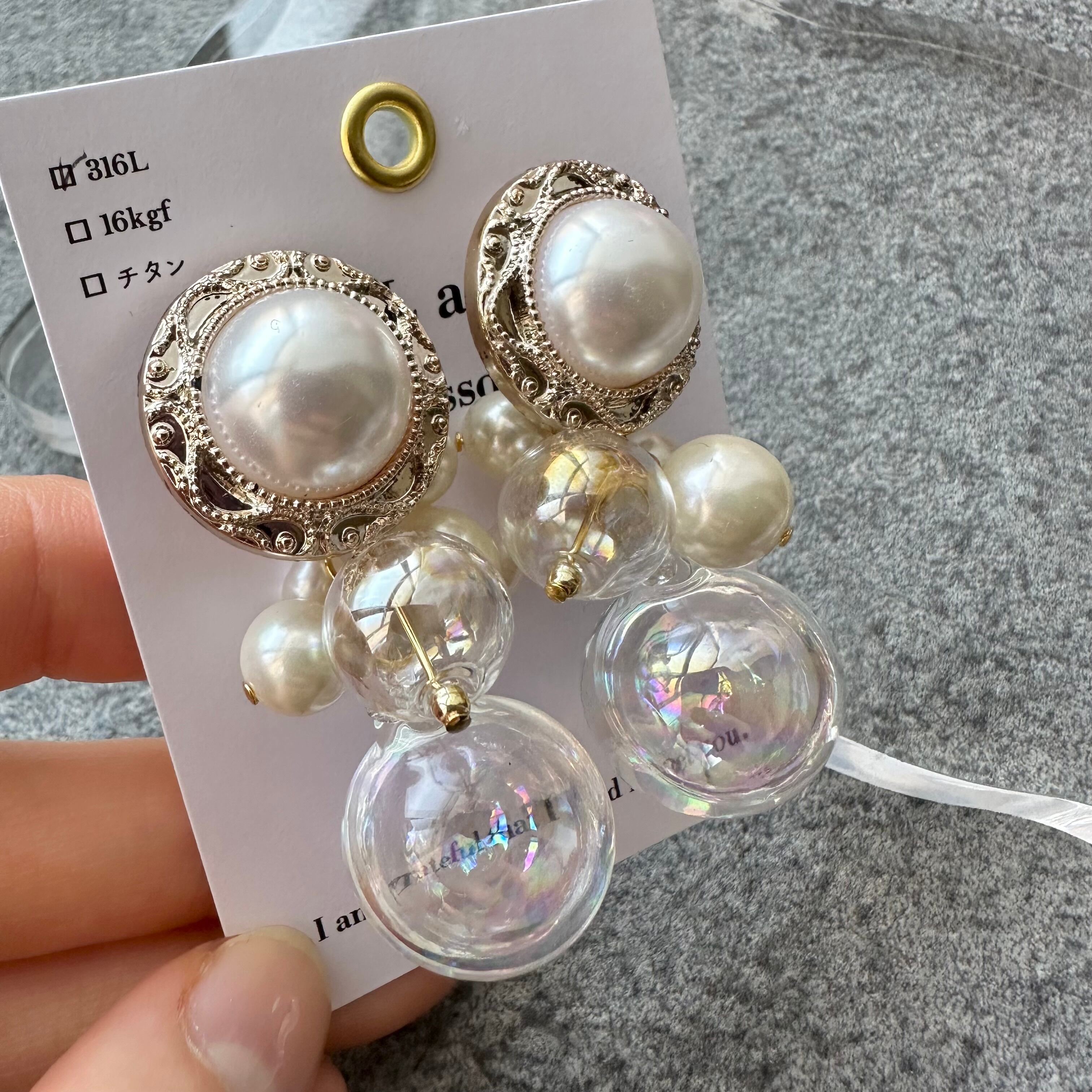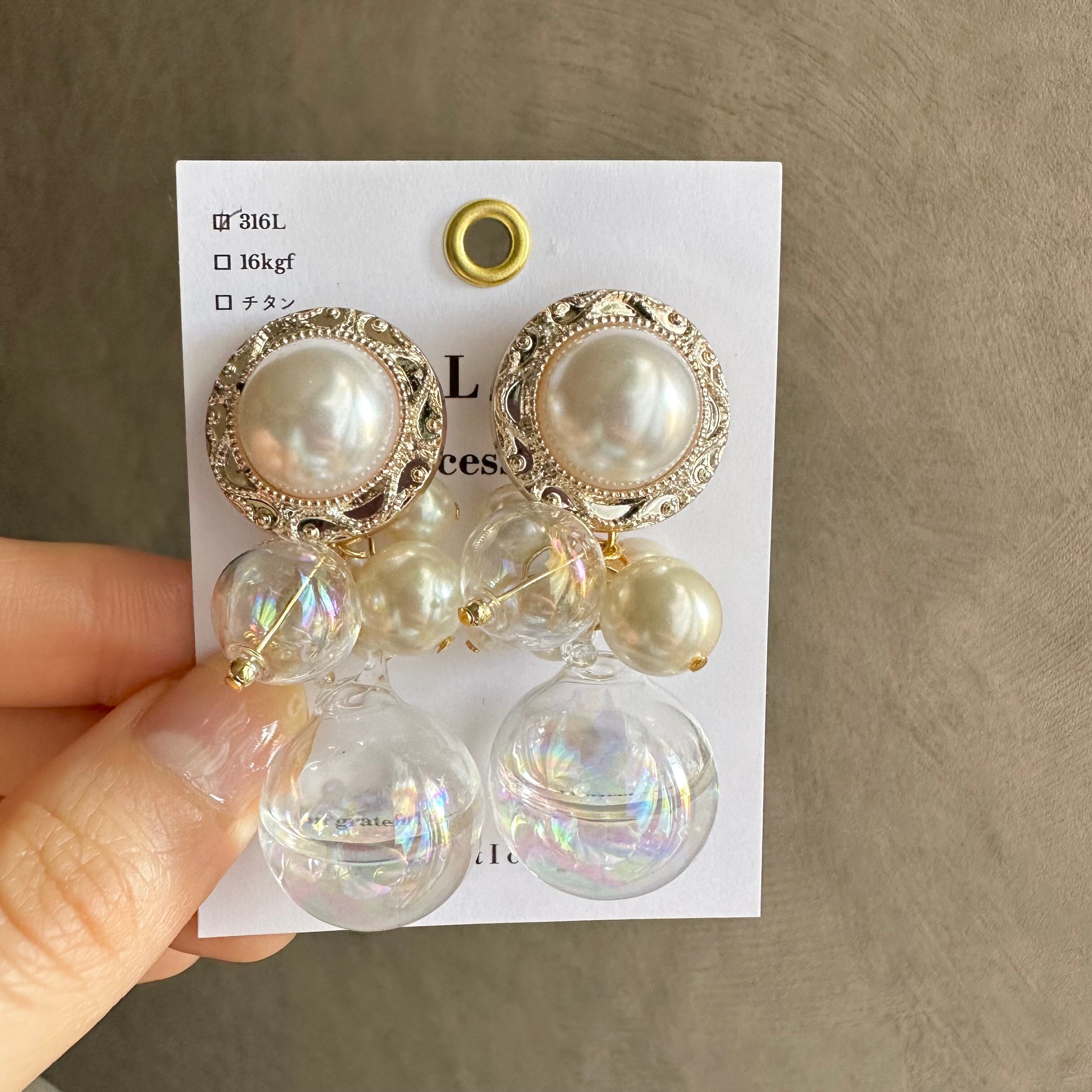 【1点物*】【ピアスのみ*】パールカボション×ウォーターインシャボン玉ピアス